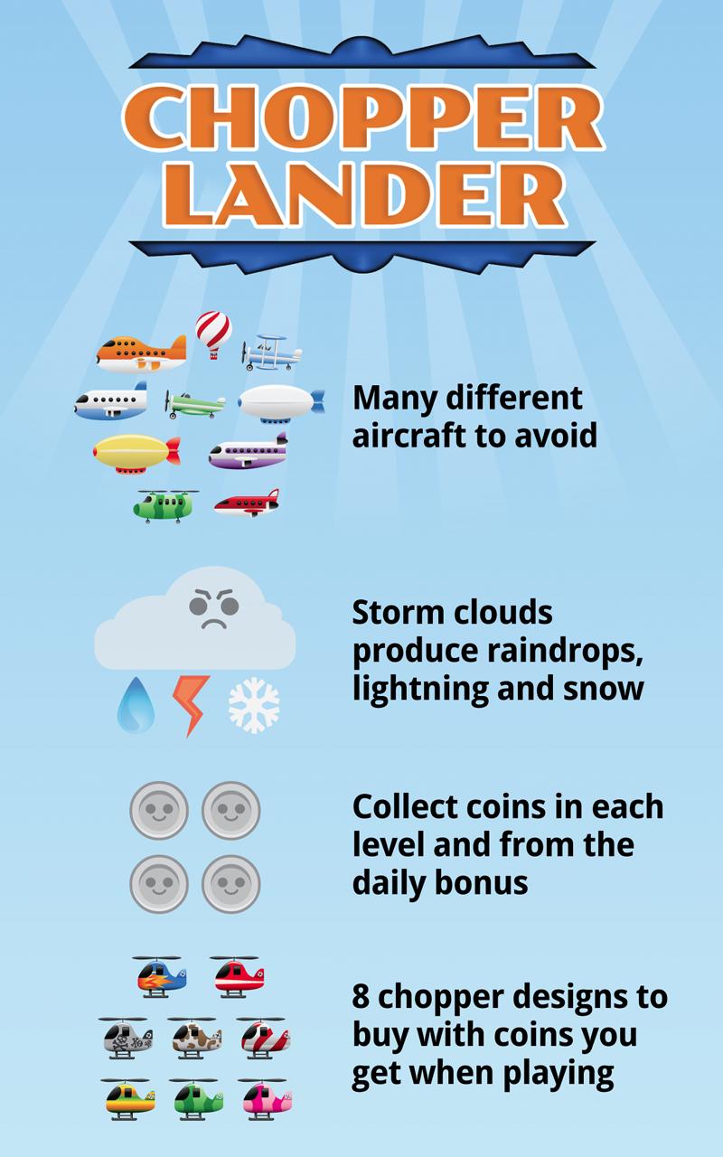 This is a classic arcade style game where you dodge the other aircraft and try to land the chopper safely. You need to try and land the chopper in the area indicated by the arrow and avoid the other aircraft. Some levels have multiple choppers you must land in order to complete the level. Each level has coins you can collect which you can use to buy other chopper designs. While being touched by clouds, raindrops or snowflakes you can’t move and lightning will destroy you. Good luck!