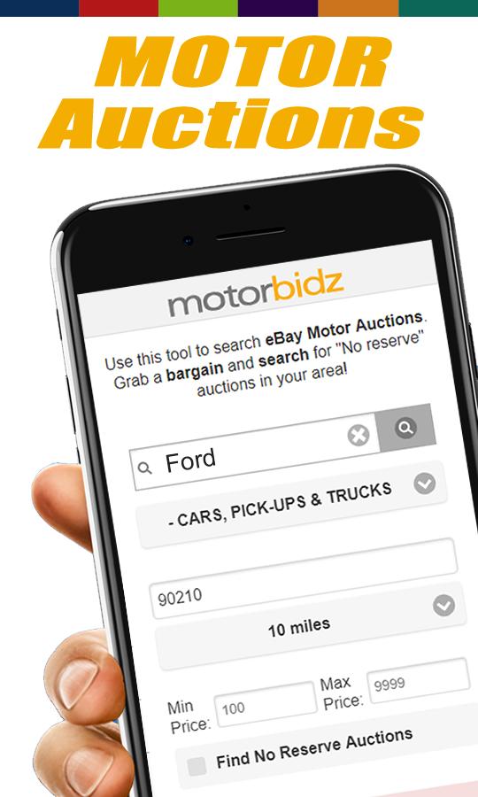 Use our app to search for motor auctions on eBay. Grab a bargain and search for "No reserve", "Zero Bid" and "Ending Soon" auctions in your area! Just enter your zip/postal code and find vehicle deals in your area!