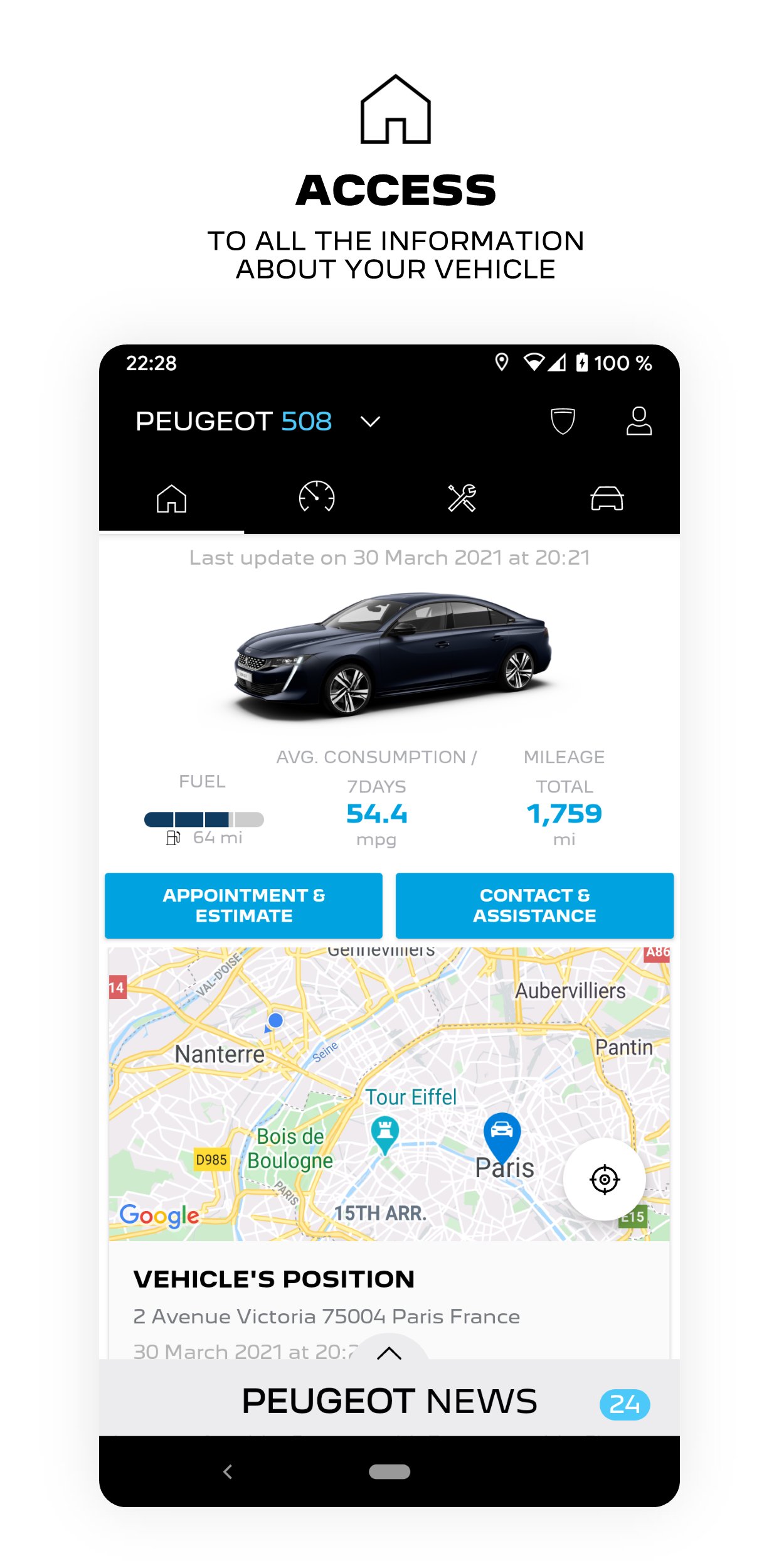 All PEUGEOT models are compatible with the MyPEUGEOT application. However, if your PEUGEOT is not equipped with Bluetooth or does not have the ability to use our Connected Services, the ‘Driving’ tab (which provides details of your journeys, fuel consumption and mileage) is not displayed. You can still enjoy all of the other features of the app.