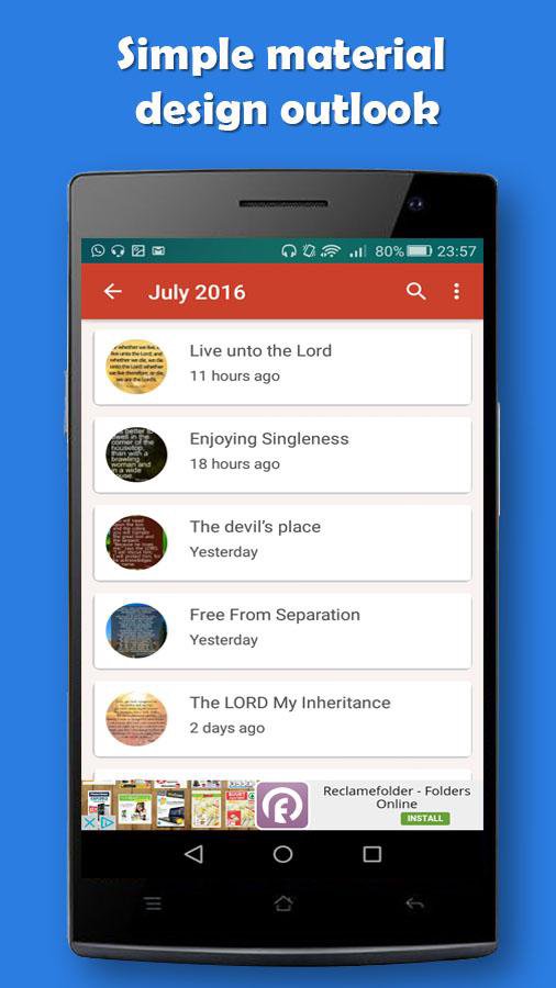 The bible devotion has been kept short so you can read it on the go. We call this short devotion because it is meant for you to read quickly and then spend the rest of the day meditating on it. Every morning you get your daily dose of bible devotion to start your day. This app requires internet for the daily update.