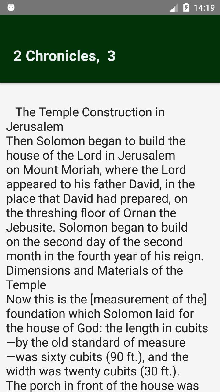 You can read Bible offline. User interface is designed for easy navigation. Very easy access to all Chapters of Holy Bible.