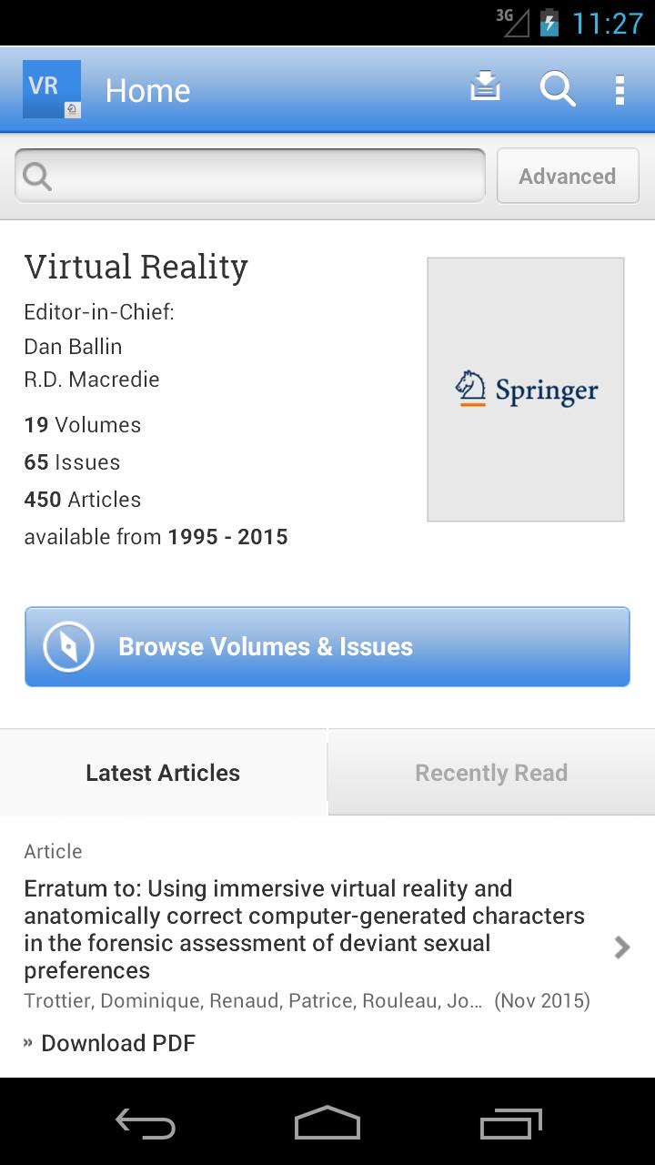 Tap into the most recent developments in the field of virtual reality with the Virtual Reality app. Virtual Reality is a peer-reviewed journal published by Springer Science+Business Media. The Journal publishes original articles on a wide range of topics, to fully capture the multidisciplinary nature of the field. From business and commerce to telecommunications, entertainment and gaming to medicine, Virtual Reality covers a wide range of specific application areas.