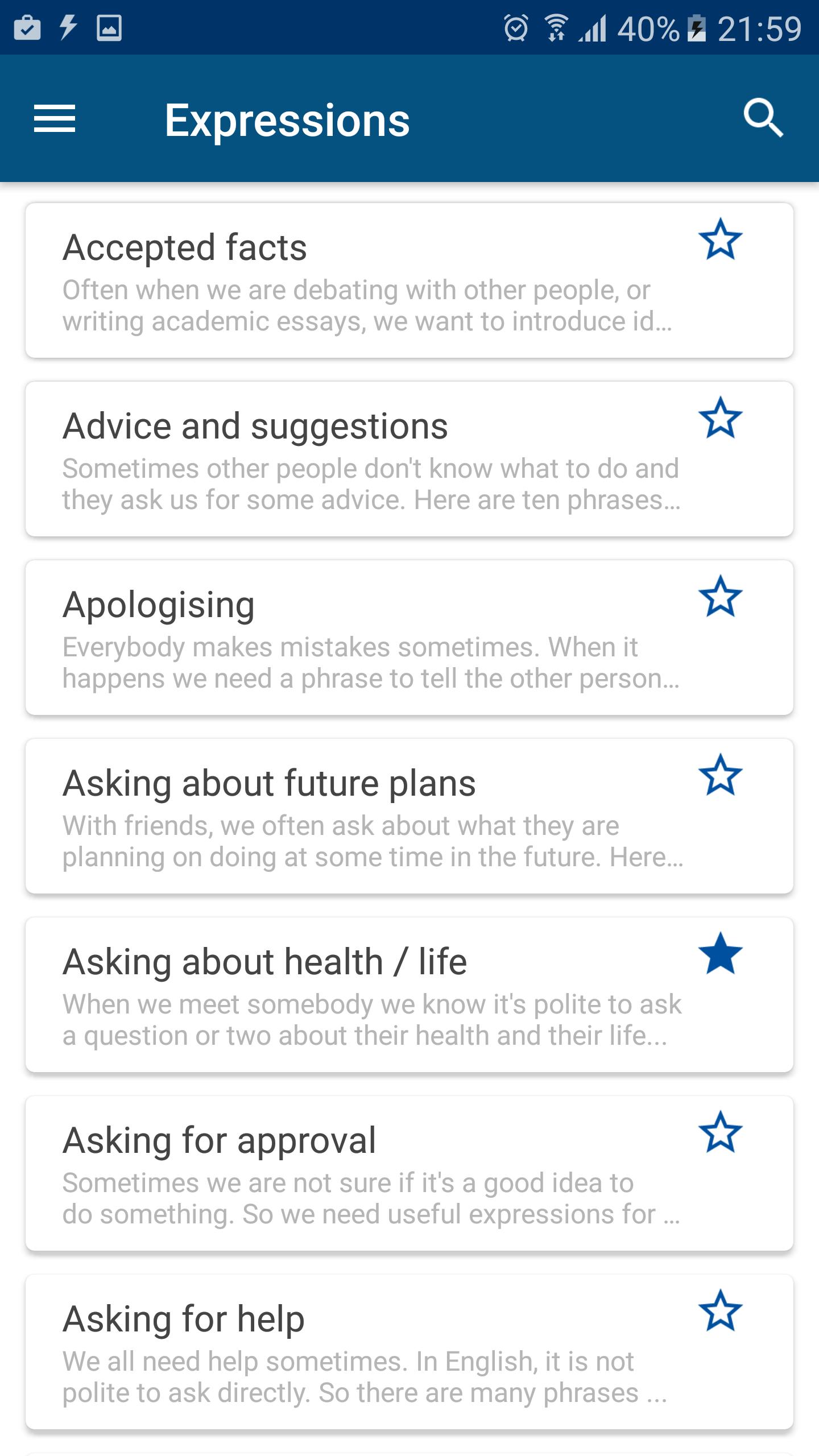 This app contains 1190 common and useful expressions or phrases which you can use to improve and strengthen your English skills.