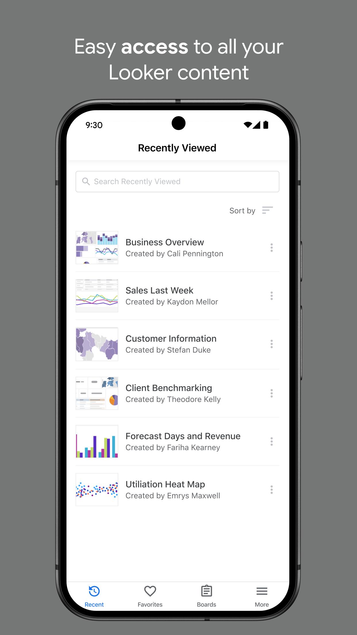 - Access Dashboards and Looks from boards, favorites, recently viewed or through search