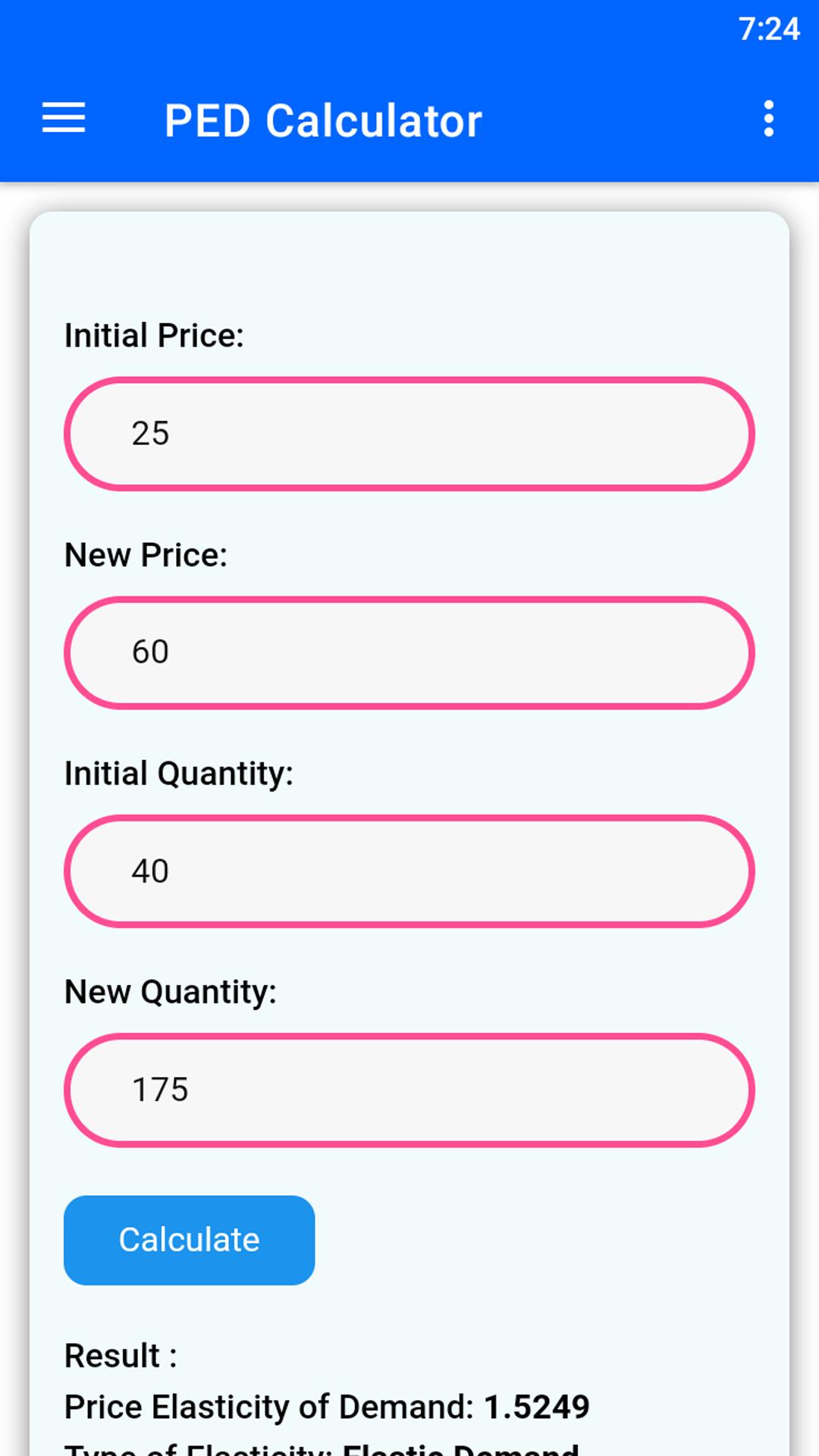 You can use this Price Elasticity of Demand (PED) Calculator app to know the price elasticity of demand. Price elasticity of demand is a measurement of responsiveness of consumers to change in price of a product.
