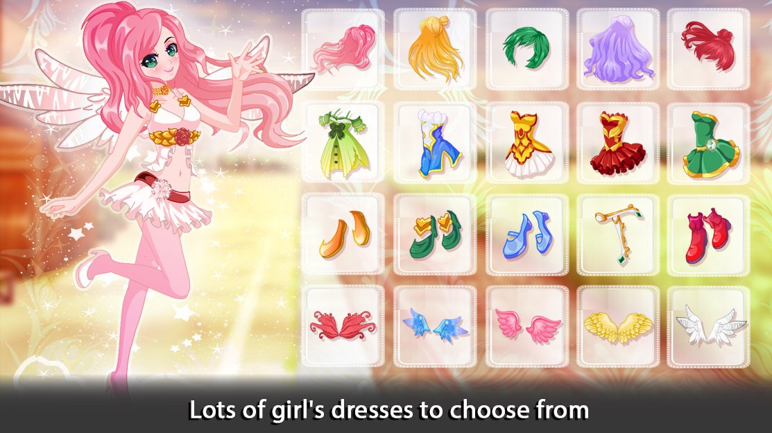 explore the adorable wardrobe and colorful clothing items into an outfit designer maker, decorative accessories, and use them to create the best angel. choose among dozens of angel items, then you can select the hairstyle, shoes, wings, tops, skirts, luxurious jewelry and other accessories like earrings and necklace and hair bands and don't forget to be matched with her dress. and don't forget to accessorize a pretty dress with a necklace and give the girl a stylish touch with a gorgeous hairstyle make sure to be sparkles and glitter to have a perfect spring/summer fashion look.