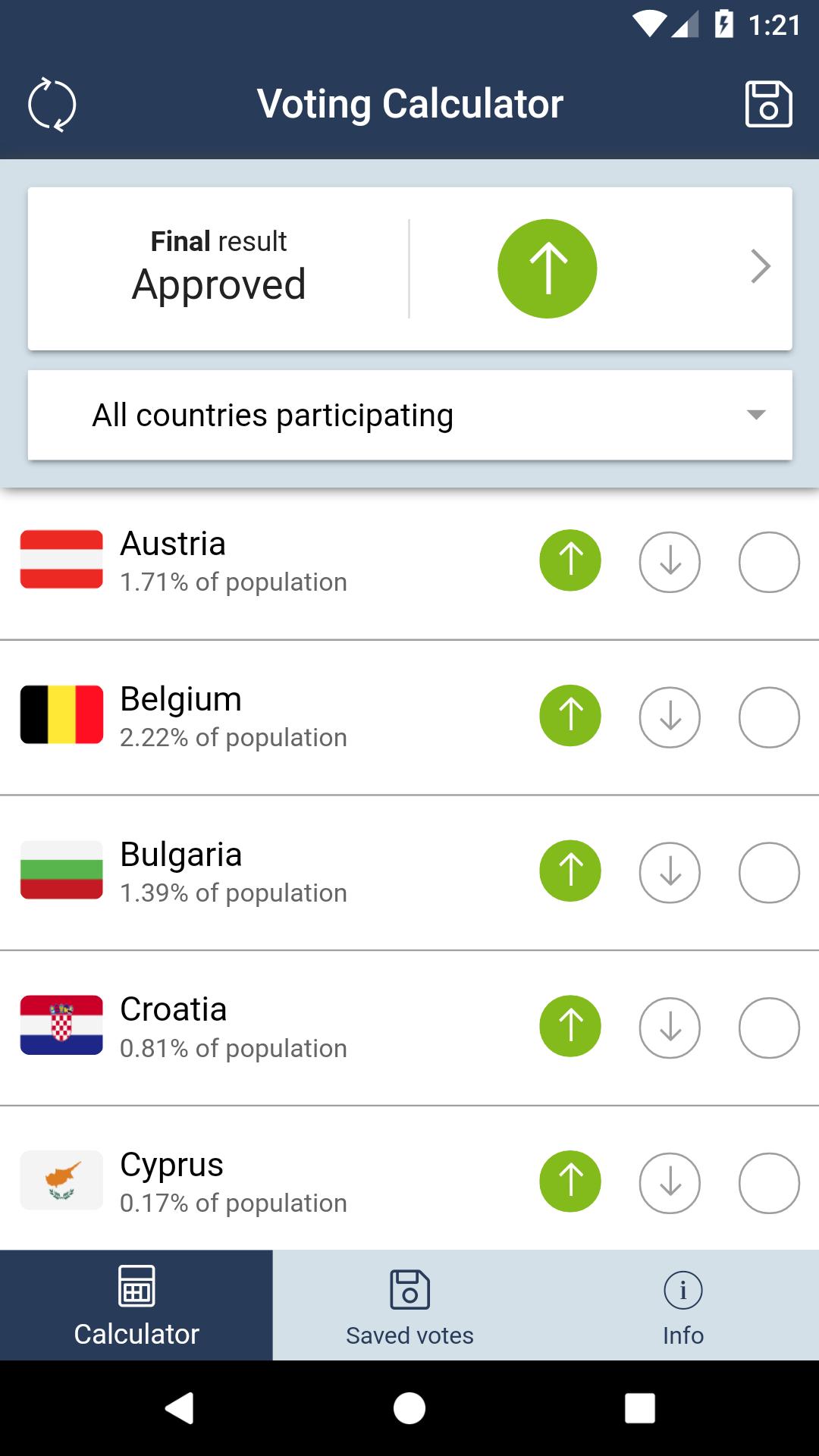 The voting calculator app is a must-have for anyone following meetings of the Council of the EU, its working parties or Coreper. The voting calculator makes it easy to check if a qualified majority has been reached, anytime, anywhere.