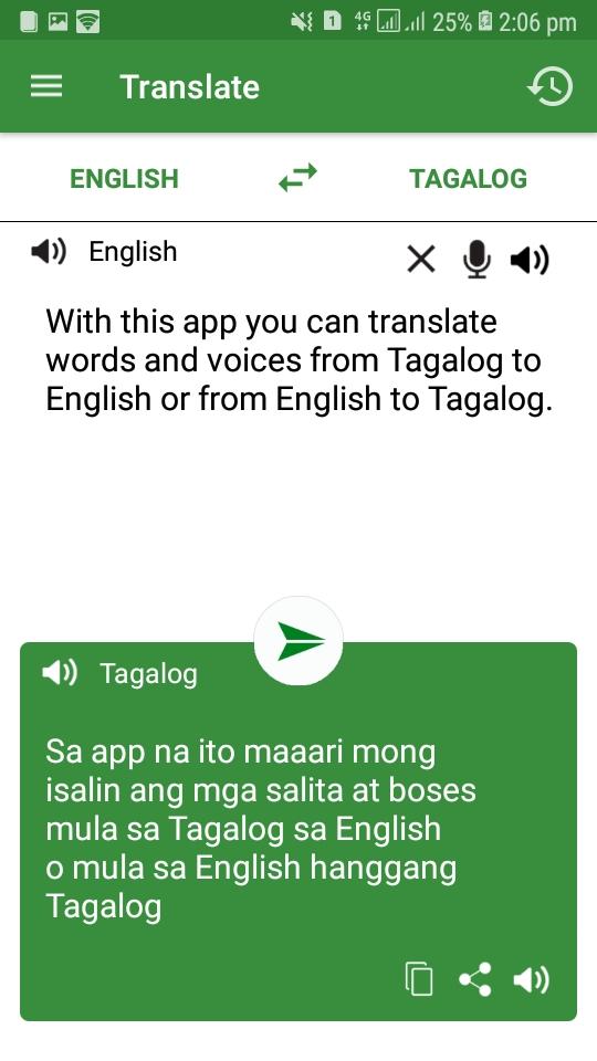 With Tagalog translator you can quickly translate Voice and Text from Tagalog to English or Translate from English to Tagalog.