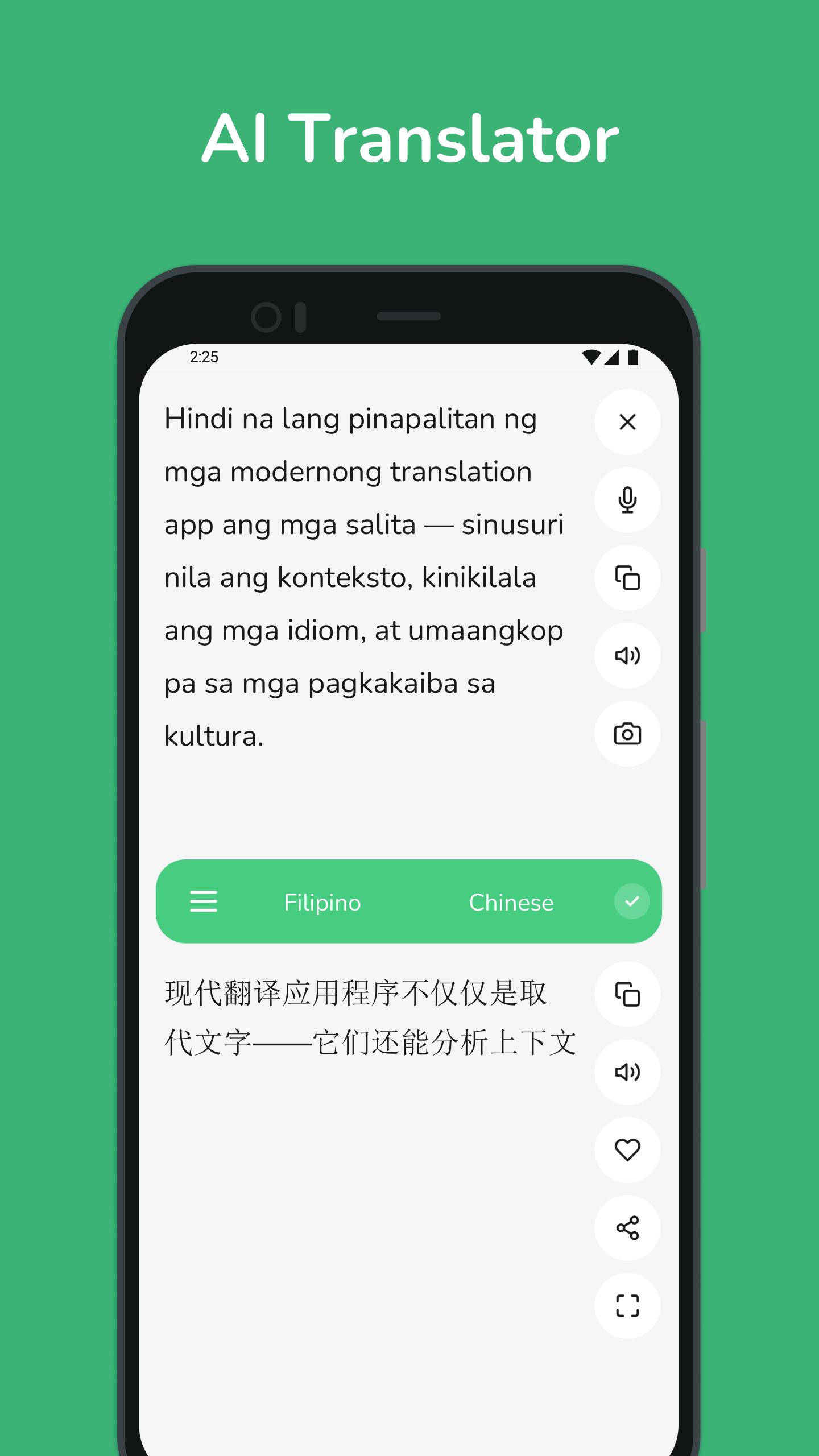 • Instant Translation: Get fast and precise translations from Filipino to Chinese and vice versa, perfect for everyday use.