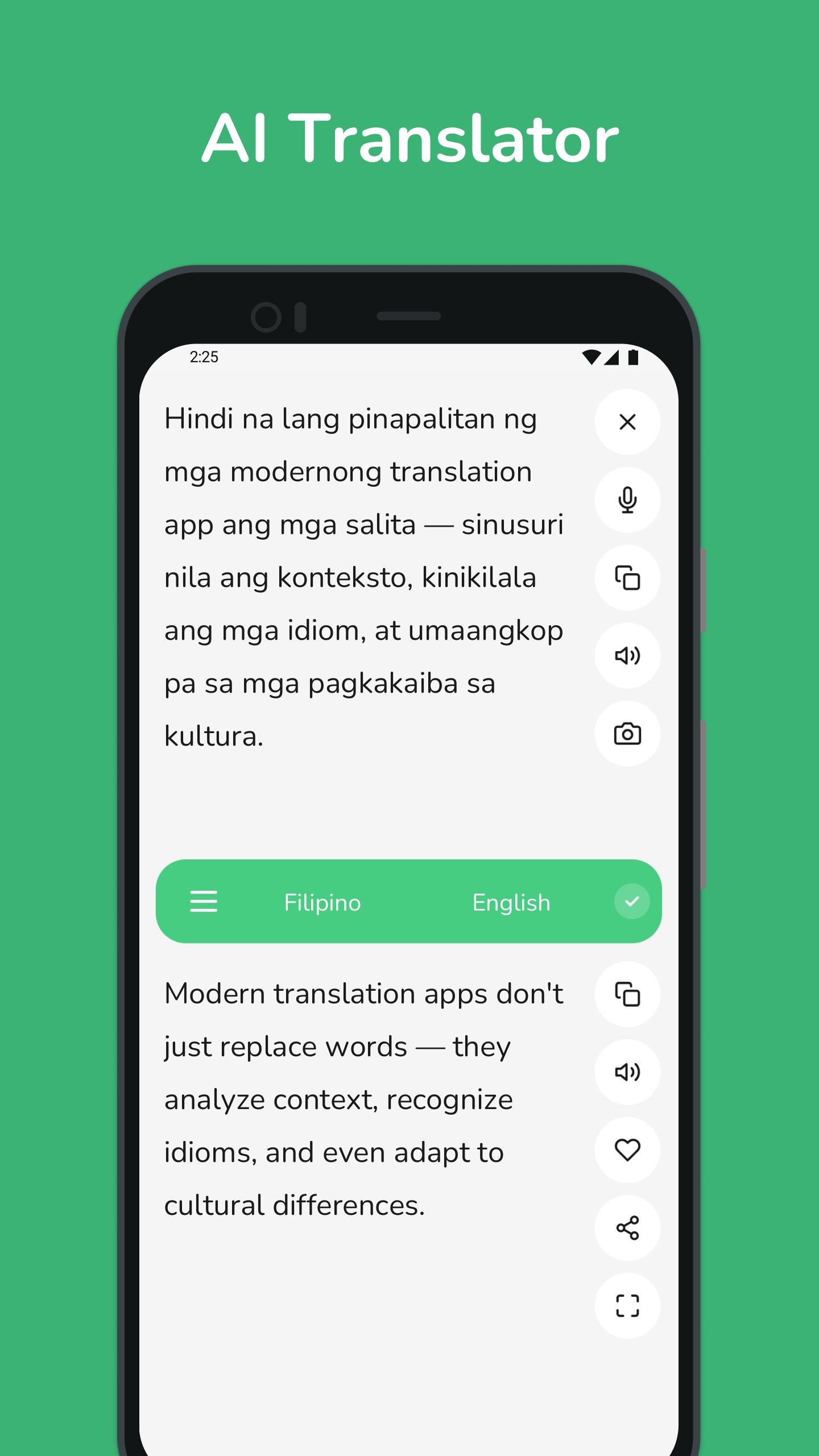• Instant Translation: Get fast and precise translations from Filipino to English and vice versa, perfect for everyday use.