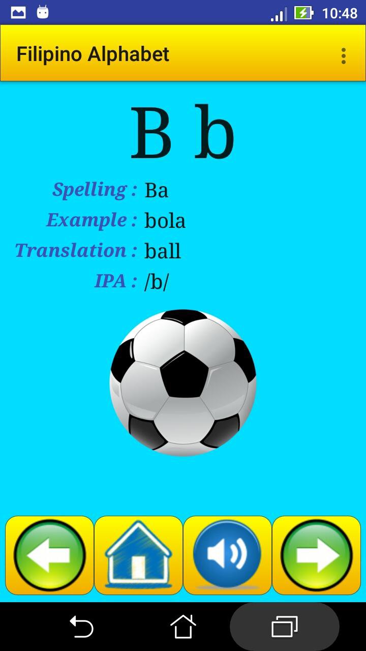 This app contain all Tagalog alphabet , exactly 20 letter , it help strangers students in Philippines universities , for learning and speaking the alphabet and the pronunciation .