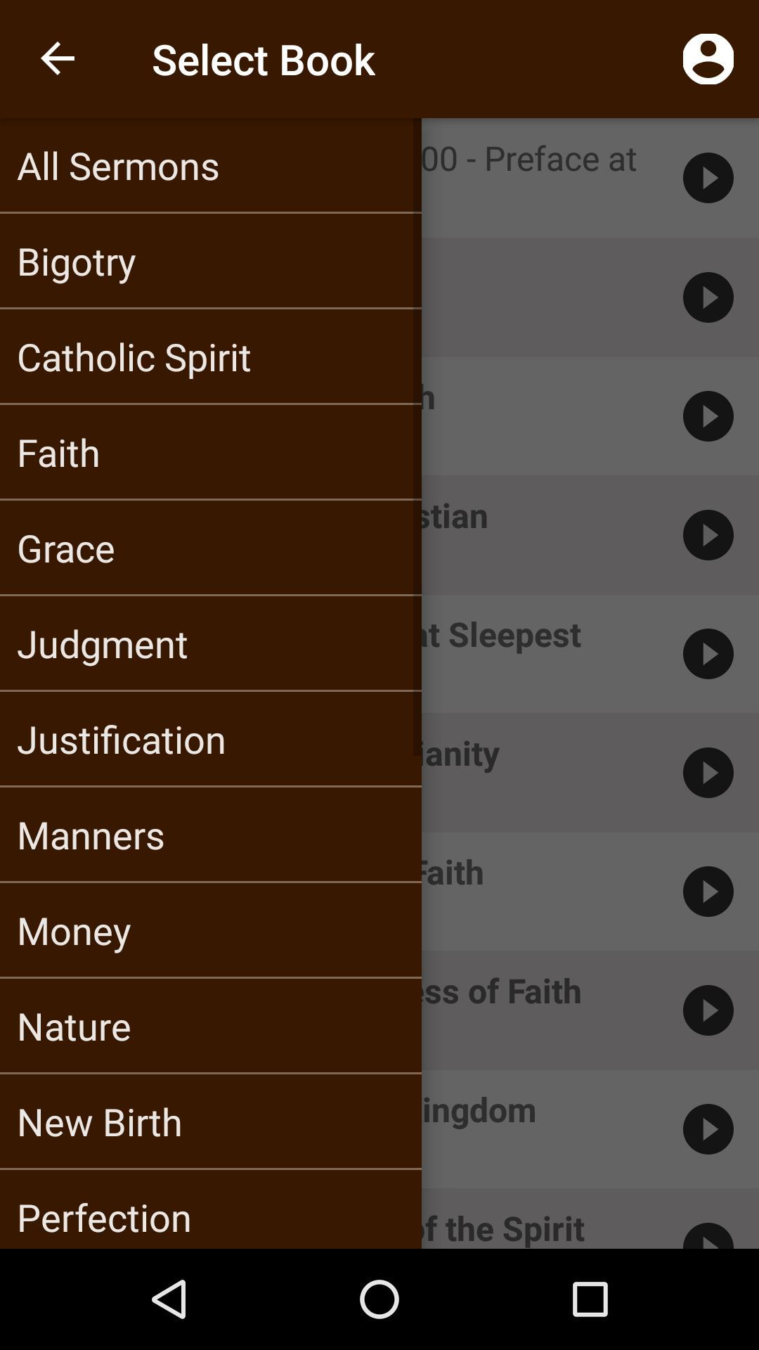 Sermons include many topics, including but not limited to Bigotry, Catholic Spirit, Money, Sermon on the Mount and many more.