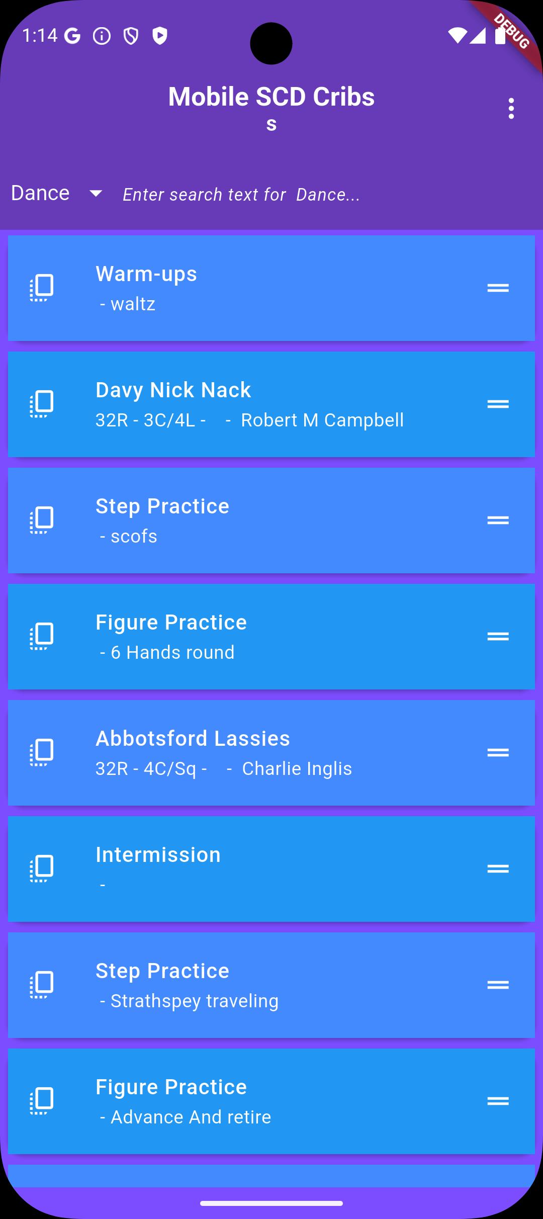 Display crib instructions, Keith Rose diagrams, videos and information/personal notes of each dance on the list. All but the videos will remain available even if your device is offline.