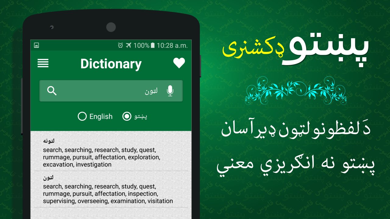 Vipapps offer you the best Pashto Dictionary For all the Pashto speakers who are interested in learning English and for all the English speakers who are interested in learning Pashto, the English to Pashto dictionary app is the best solution of learning more about either of the languages. The English to Pashto and Pashto to English dictionary feature allows you to search for Pashto meanings of the English words, whereas, the Pashto to English dictionary feature of the app allows you to search for English meanings of the Pashto words.
