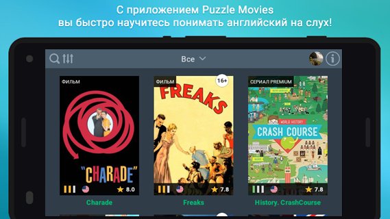 Puzzle Movies - it's movies, cartoons and TV shows in English with double subtitles: English and Russian. In each film by pressing the pause able to view the content of conversations and contextual translation of any word. Under Premium additional materials are: videoobyasneniya complex expressions and vocabulary lexicon used. We regularly replenish collection of films, cartoons and serials - learn English is easy and fun on the Puzzle Movies!