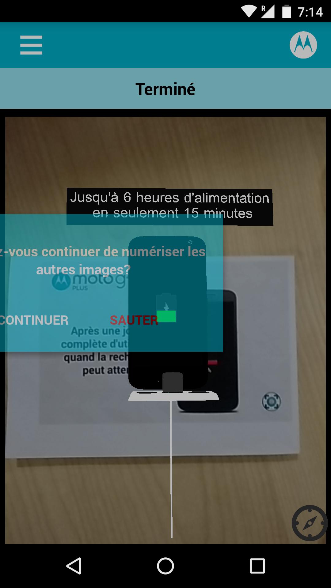 Découvrez les fonctionnalités incroyables de Moto G4 Plus à l'aide de la réalité amplifiée. Il suffit de télécharger les images incitatives de l'application et de les numériser au moyen de l'appareil photo de votre téléphone en les imprimant. Rapprochez votre téléphone de l'image pour l'agrandir, ou éloignez-le pour la réduire. Visualisez les animations de n'importe quel angle (de devant, du dessus ou de derrière). Le format de l'image détermine la taille de l'animation : numérisez une petite image pour visualiser une version réduite de l'animation. Placez ensuite l'image sur votre poignet pour voir les différentes options de couleurs, les applications, et bien plus encore. Numérisez une grande image pour visualiser une version agrandie. N'oubliez pas de garder la mise au point de votre téléphone sur l'image pour visualiser les animations.