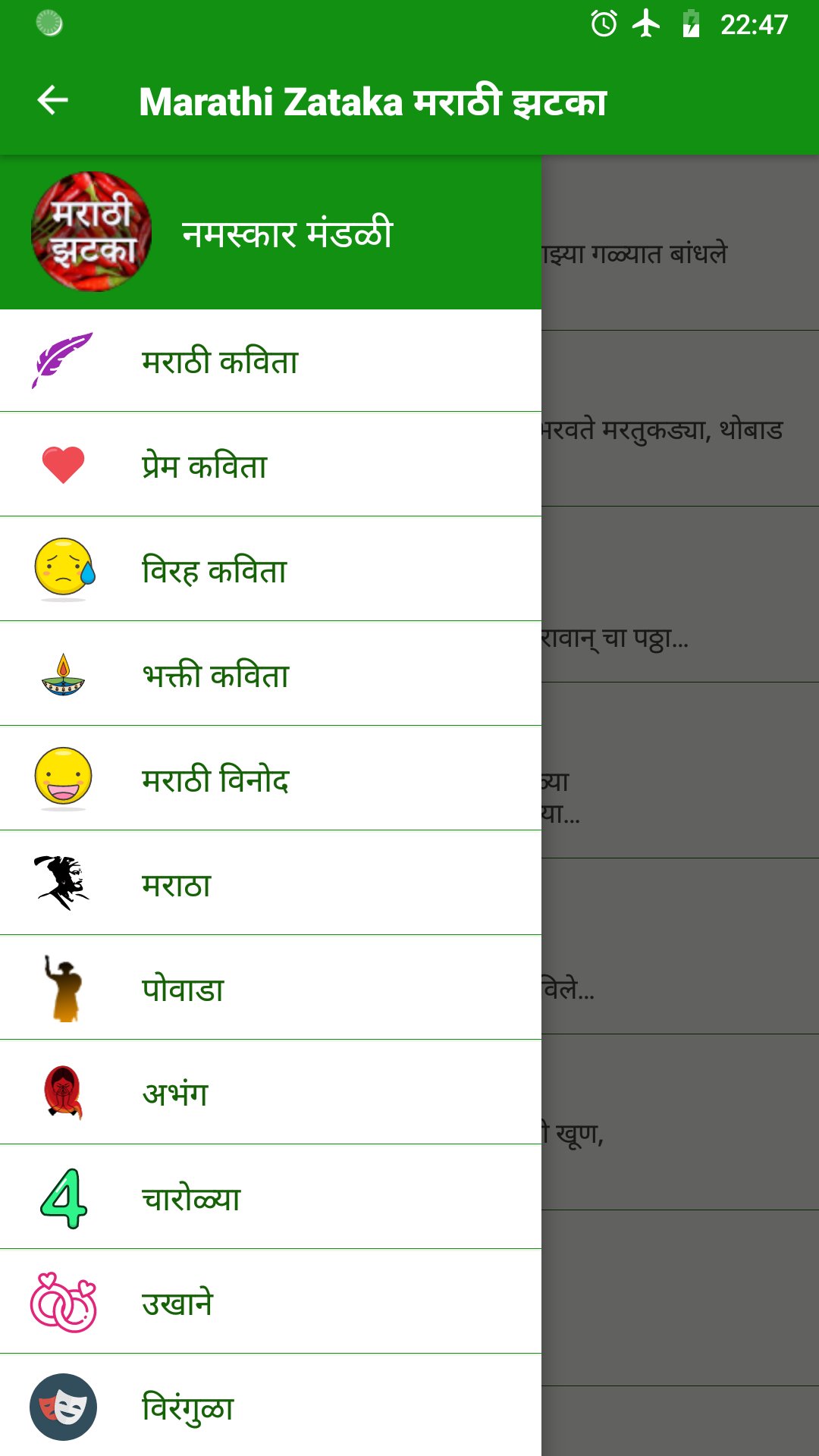 It has content like Marathi Kavita, Vinod, Grafity, Powada, Marathi poetry, jokes, stories etc. (मराठी कविता, विनोद, ग्रॅफिटी, पोवाडा, मराठी कविता, विनोद, कथा)