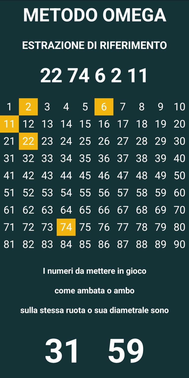 Enter the five numbers of any draw of the ten reels; from these numbers will be calculated those to be put into play (ambata or both) for the four successive extractions on the same wheel or its diameter.