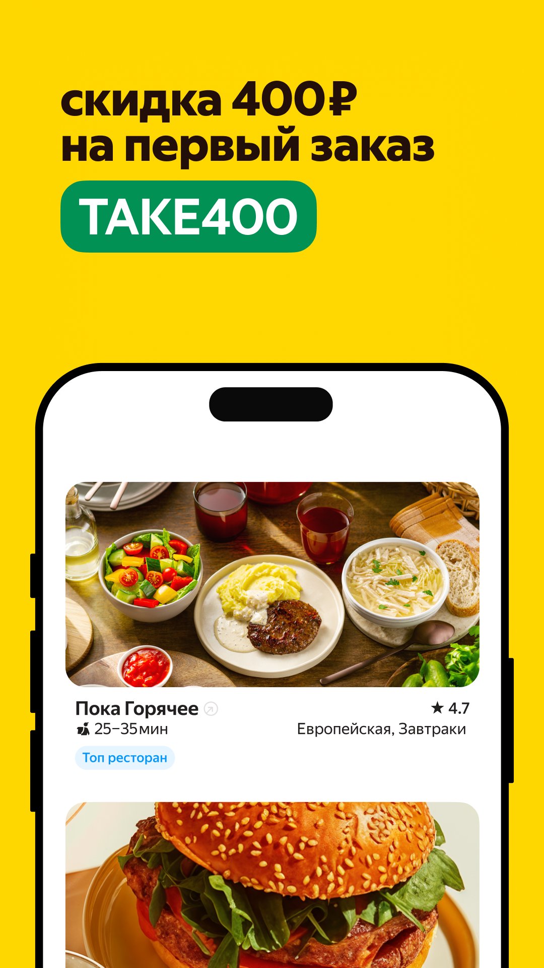 We also offer a discount for first-time orderers. Save up to 400 rubles on your first order of 800 rubles or more from Rostiks, KFC, Burger King, Vkusno i Tochka, Pyaterochka, Perekrestok, and other restaurants and stores.