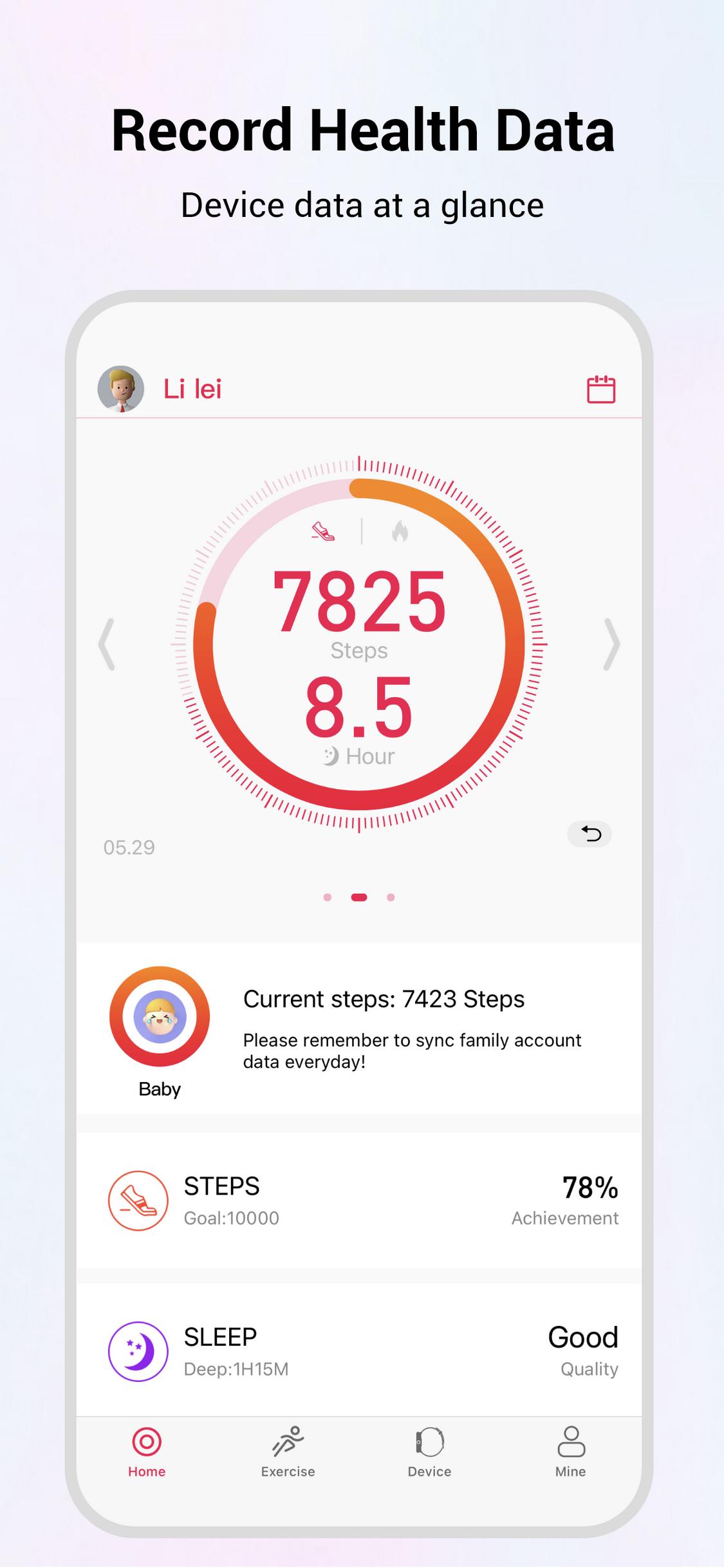 - Record daily exercise data: steps, distance, burnt calories.