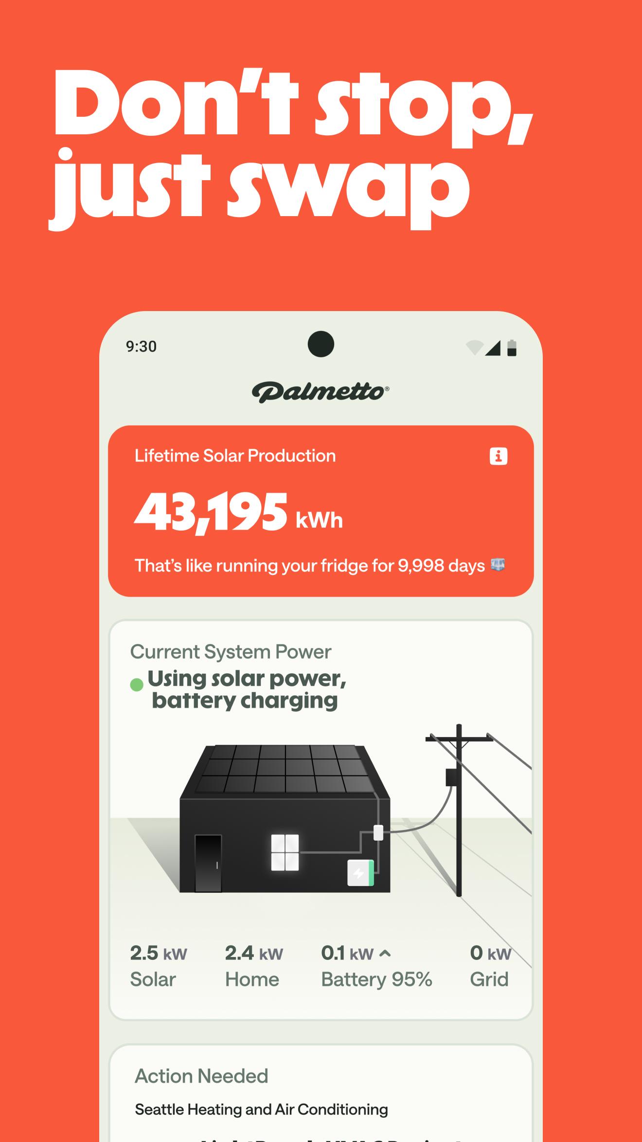 Monitor your solar energy production and consumption, earn money by referring friends to go solar, get customer support, schedule maintenance, and view your account with the Palmetto app. It’s an essential app for homeowners with solar! Get information on your energy usage quickly and easily, right from the palm of your hand, when and where it’s convenient for you. Learn everything you need to know about your home’s energy and make sure your system is running at peak efficiency.