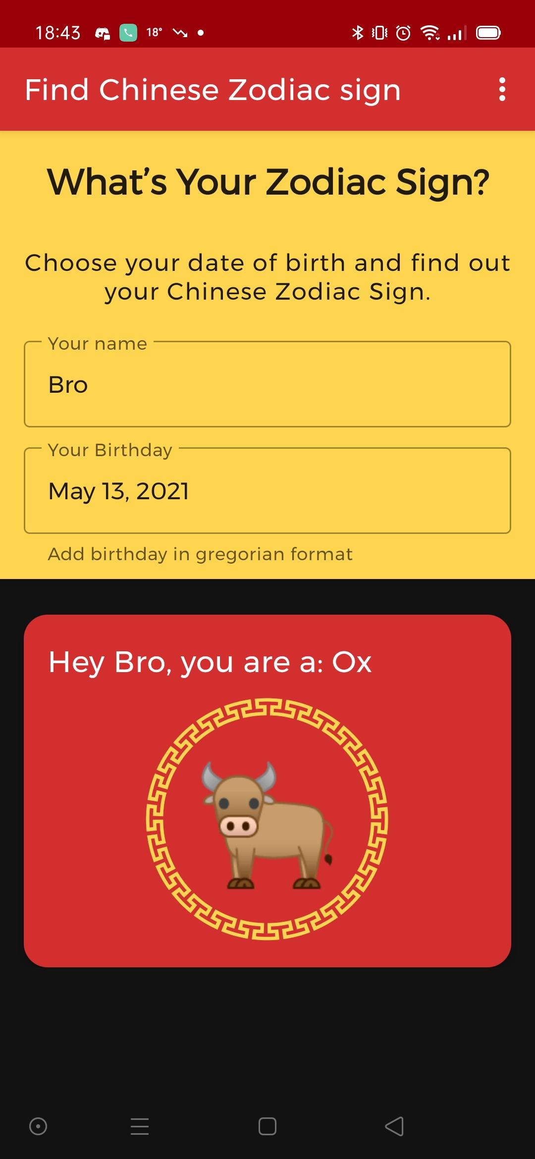 You can use our zodiac calculator to search for your animal sign. Select your Gregorian date of birth in the app, and it will reveal your date of birth according to the lunar calendar, together with your chinese zodiac sign.