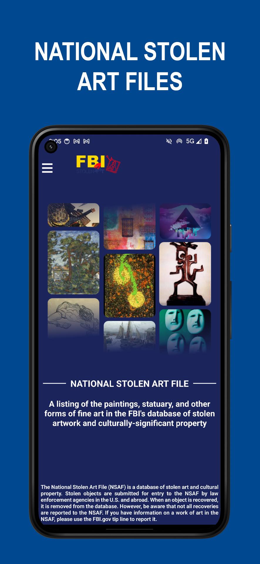 Ang FBI National Stolen Art File, na nagmumula sa developer na FBI.gov, ay tumatakbo sa Android systerm sa nakaraan.