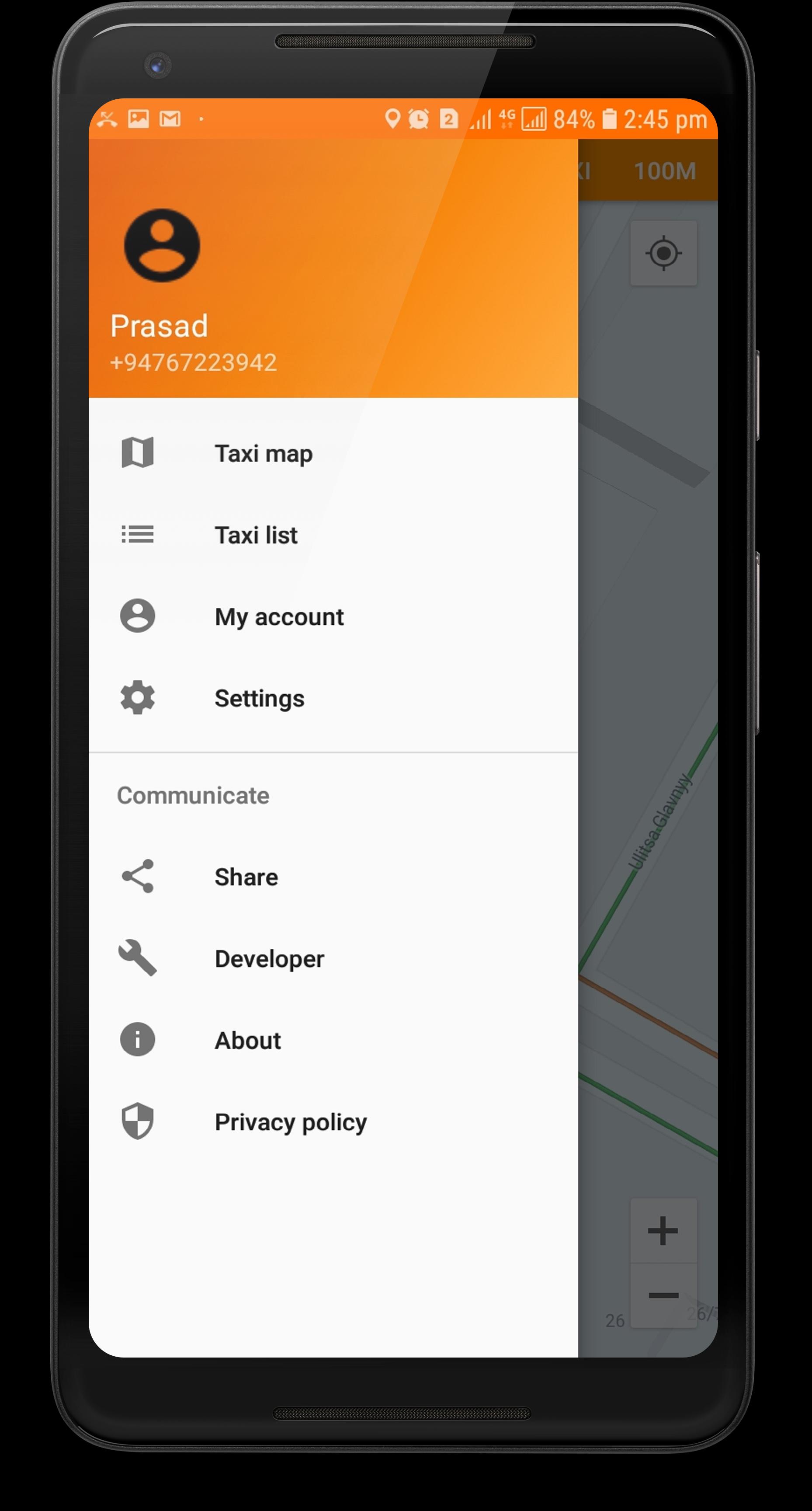 After successful registration Google map view will appear. You should enable Location to identify your present location. App will load the nearby taxis on the map according to your present location.