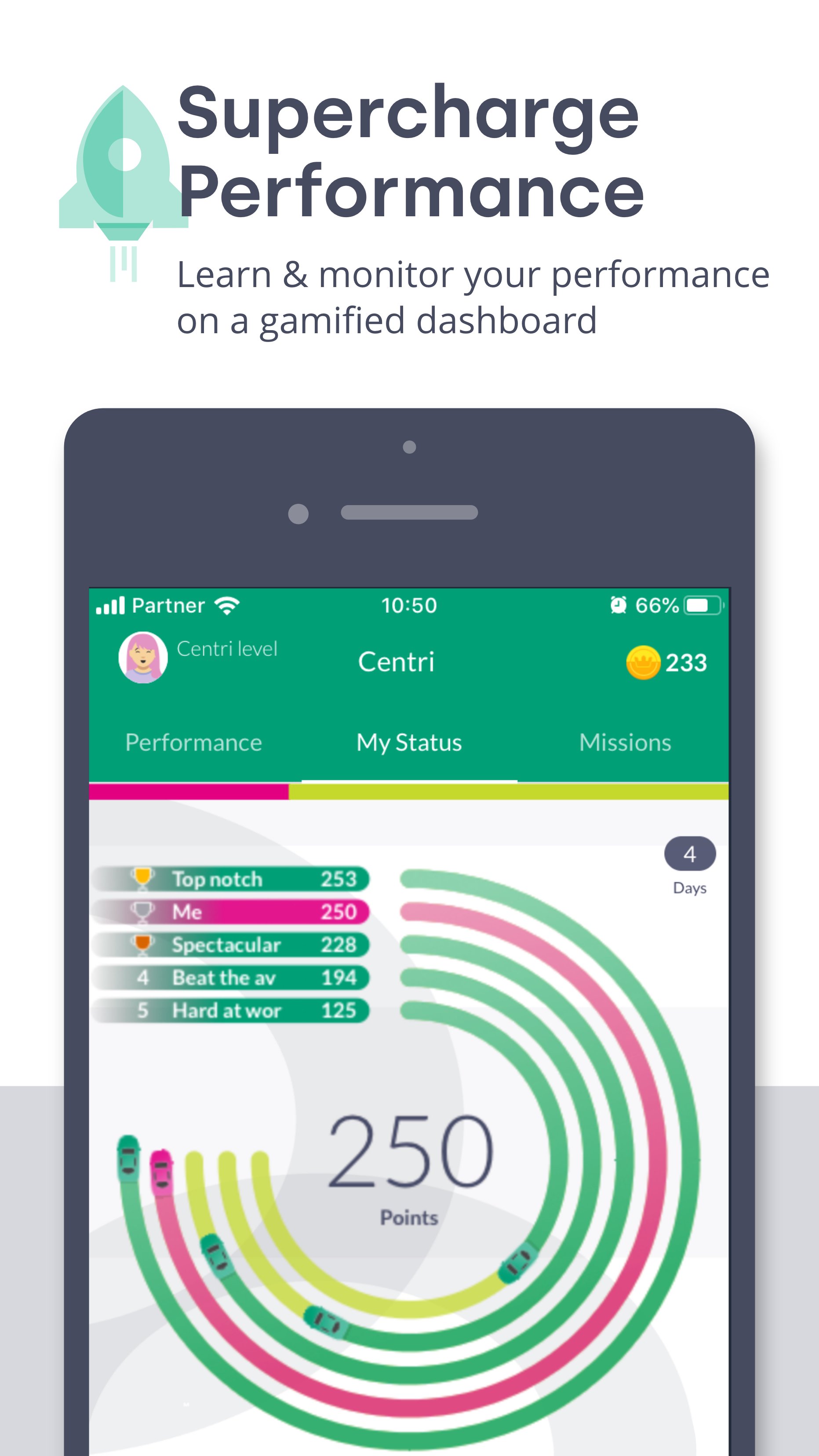 The app shows users, in real-time, how they’re doing and what they need to do next to hit their goals. In addition, it presents challenges and that spur them to compete with peers, across teams or individually on learning activities or goal-specific performance.