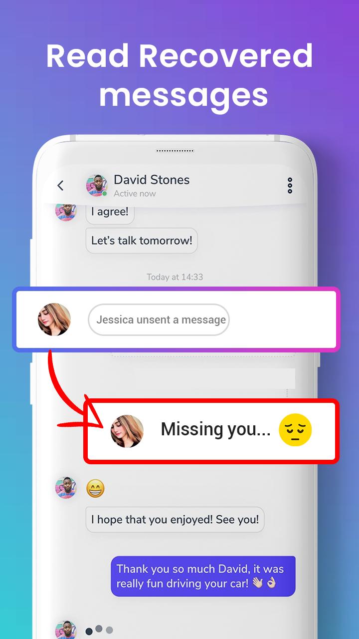 Restore Deleted Messages Software will recover and track all your deleted messages as well deleted photos and videos from chat. When a sender sends a message on your chat apps, it will also displayed in this Unread Messages app. So you can easily seen the message on your chat apps, it will also be displayed in this hide last seen app. So you can easily seen the SMS in hide last seen app whether the message is in the form of audio or video. Unread Messages or reads allows the user to read hidden chat. The sender will be unaware that you have read the messages because the message will be shown unread to the sender. There will be Unread. Be like an incognito chat reader, there will be no last seen no online with unseen messenger.