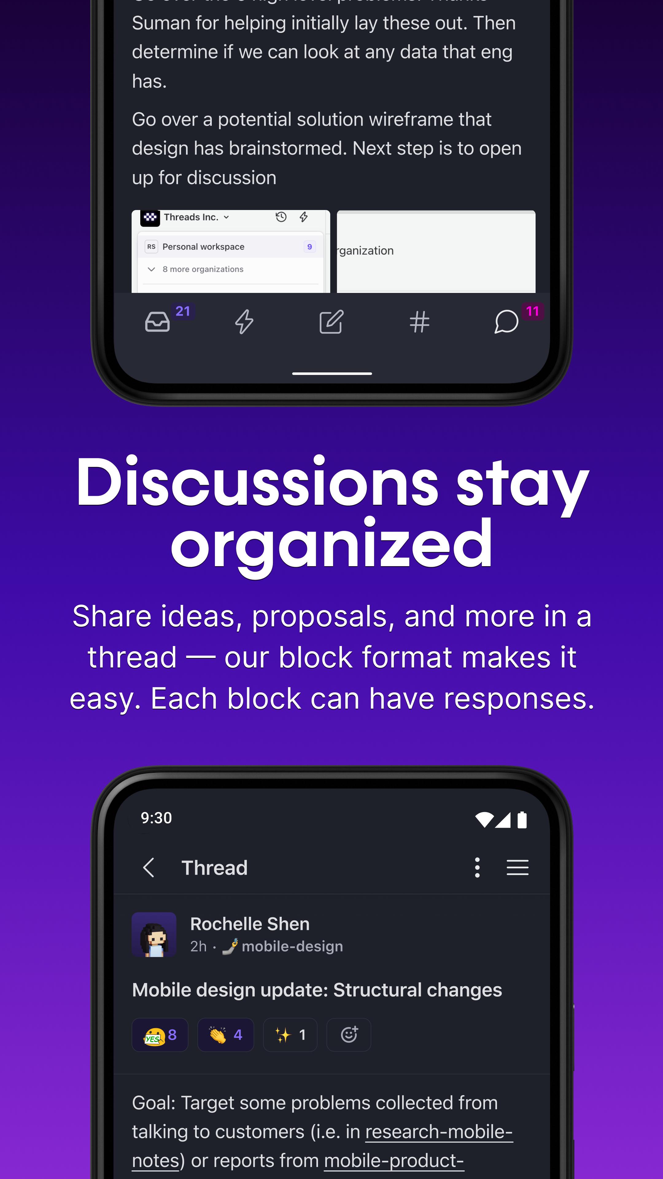 Threads are like twitter for work, which encourages punchy and easily skimmable updates & conversations, and fewer deluges of conversation that are impossible to keep up with. Breaking up longer thoughts into blocks lets your team skim, discuss, and decide on their time.