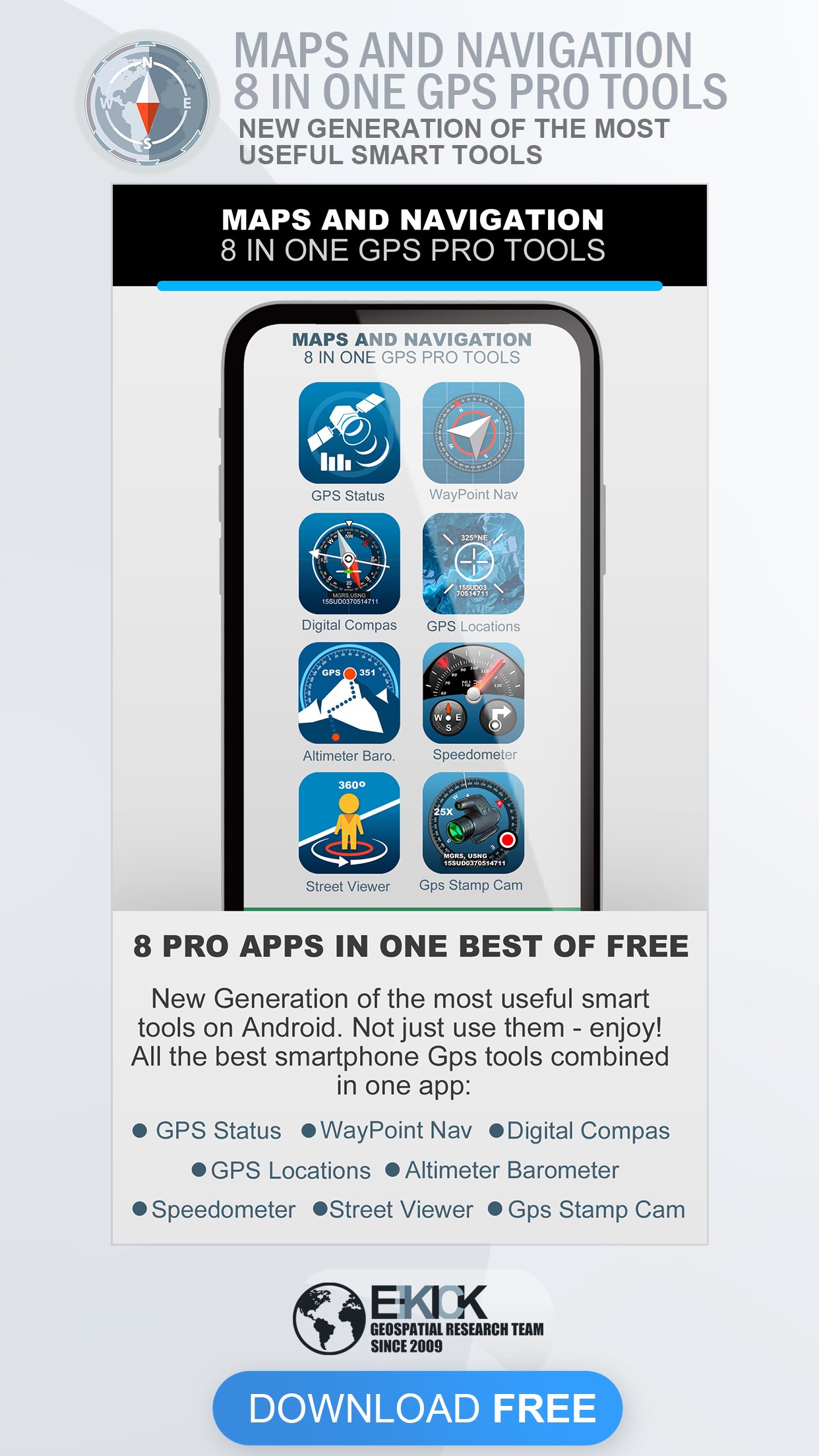 ! All the great smartphone tools combined in one app: Compass, GPS Test, Street View, Speedometer, Waypoint Navigation, Altimeter, GPS Locations, GPS Stamp camera