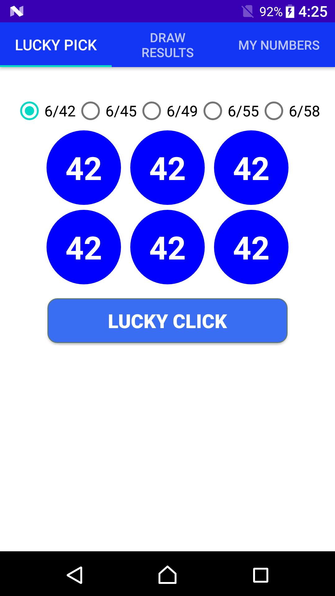 Sure lucky pick for lotto play, i.e. generate 6 numbers for 6/42, 6/45, 6/49, 6/55, 6/58. You can also save your 'lucky' 6 digit numbers.
