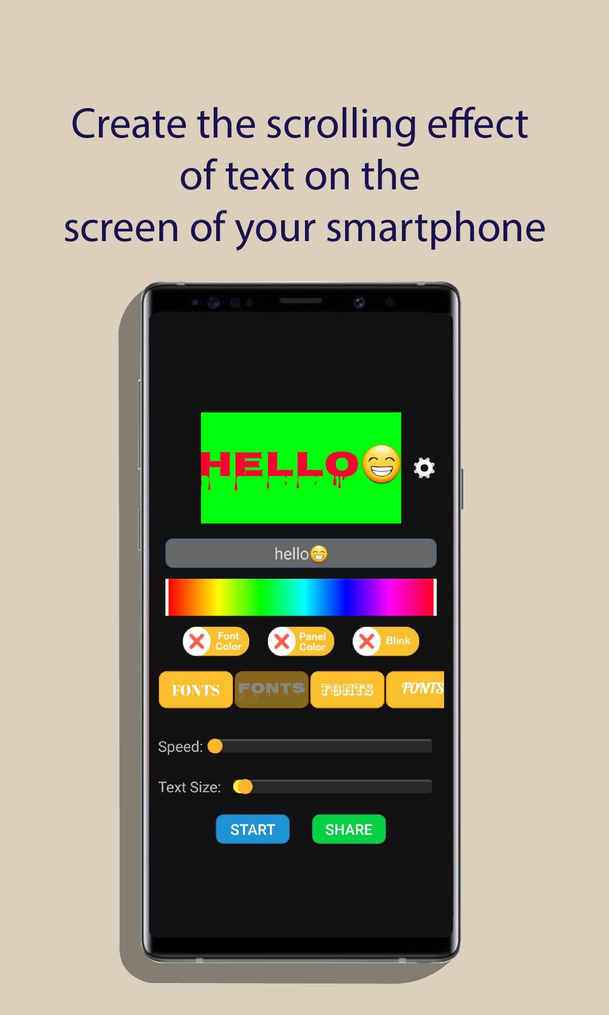 App that generates a scrolling text on the screen from the text entered by the user. You can choose between various text and background colors, font, text scrolling speed and blink screen effect.