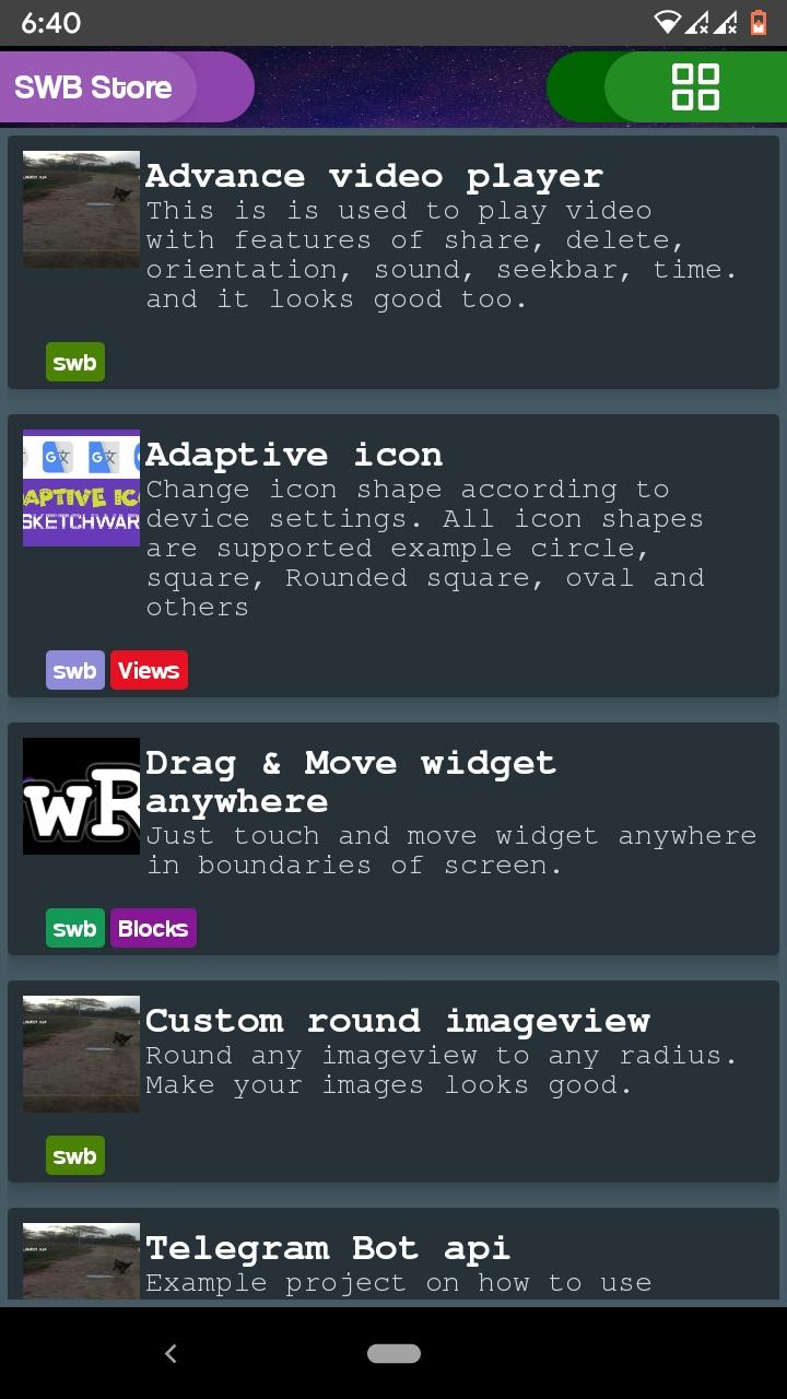 SWB Store is a sketchware projects store that offers a large variety of sketchware pro projects, libraries and blocks from a single app and compleely free. This app has functionality to open sketchware swb files and edit them. Once you download sketchware pro then install this app and you'll have best sketchware pro projects to learn developement for free. This app also provide option to sketchware backup and restore from anywhere.Also you can restore the swb you exported from sketchware pro. So why waiting just download SWB Store and get into the world of coding.