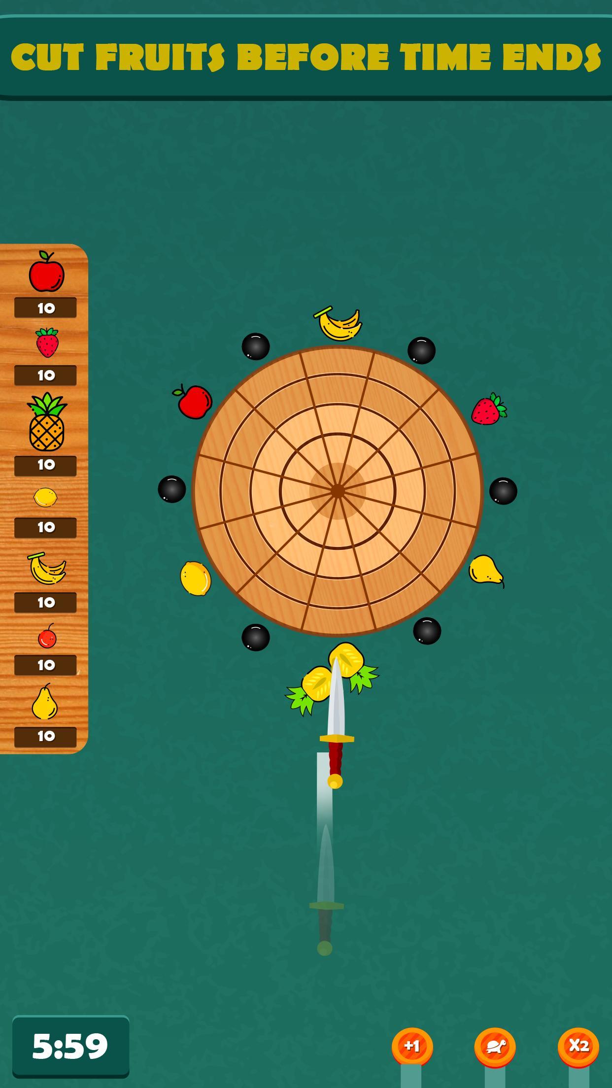 Throw the knife into the logs to break them, slash the fruits and get stars. don't hit the knives and the bomb. shot target carefully and become the take power boosters! complete your target in 10 seconds, shoot the high pointed fruits. you can use power boosters.