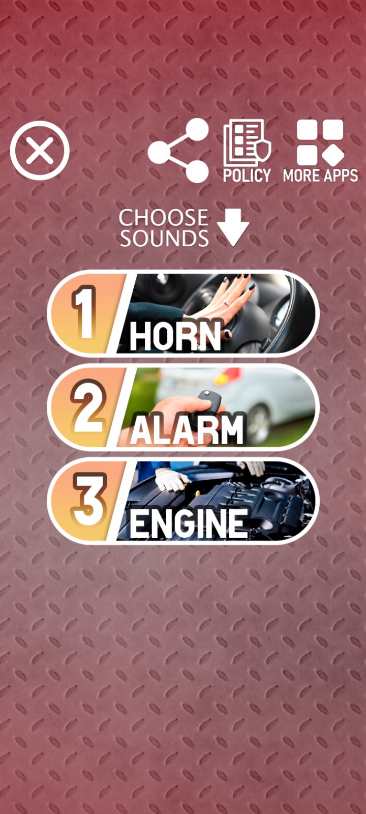 This app, which contains a collection of 36 car sounds such as a car horn, an alarm system and the sound of a car engine start.