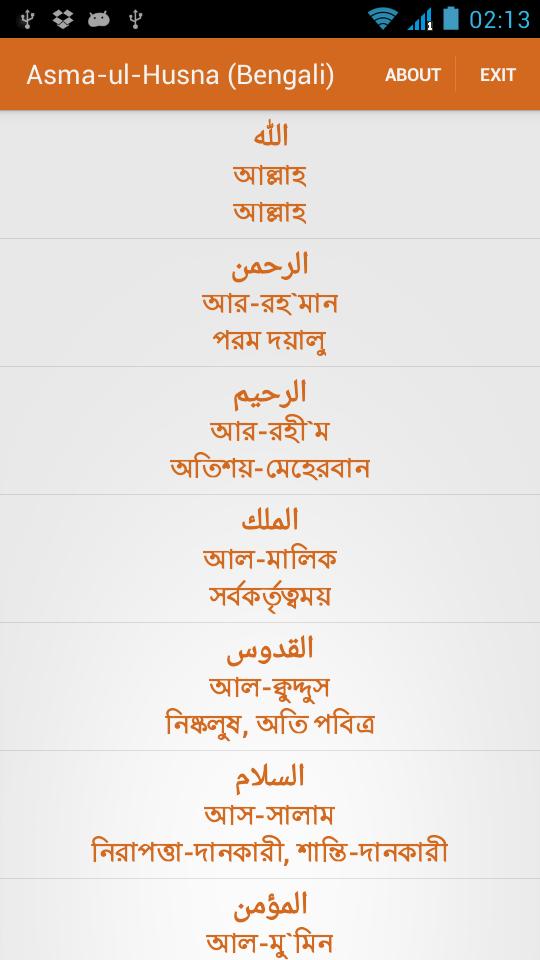 This app is optimized for Bengali language users, which contains the names in Arabic along with Bengali pronunciation and meaning.