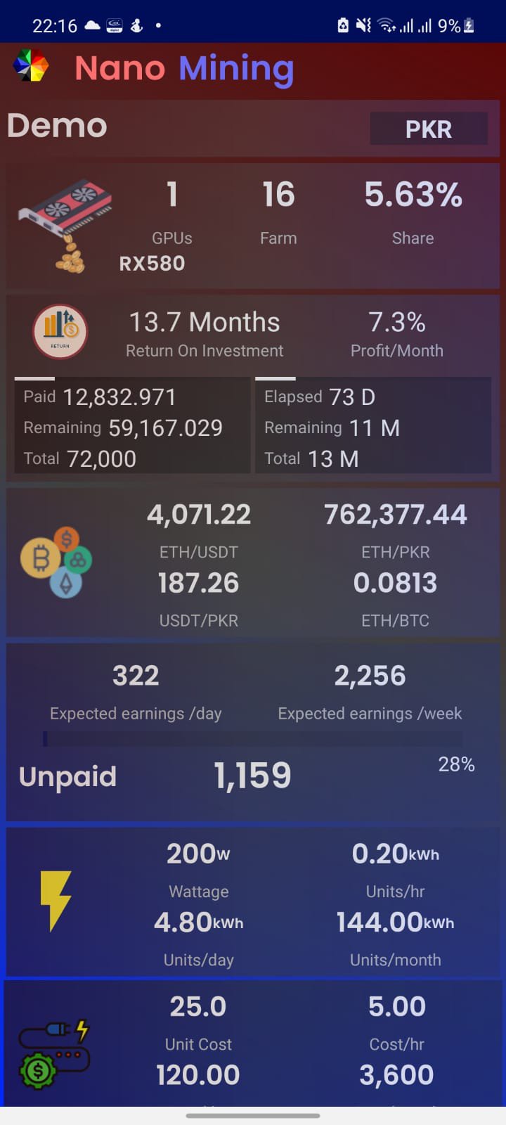 Nano Mining is a new way of Mining Crypto Currency without managing your own Rig. All the investors have to do is to invest some amount and they will be given share of the Mining Rig in form of Graphics Processing Unit (GPUs) or a percentage of GPU. Against this GPU share, the investors are given a fixed share of Hash rate, against which the profit shares are transferred to user's wallets on every Payout.