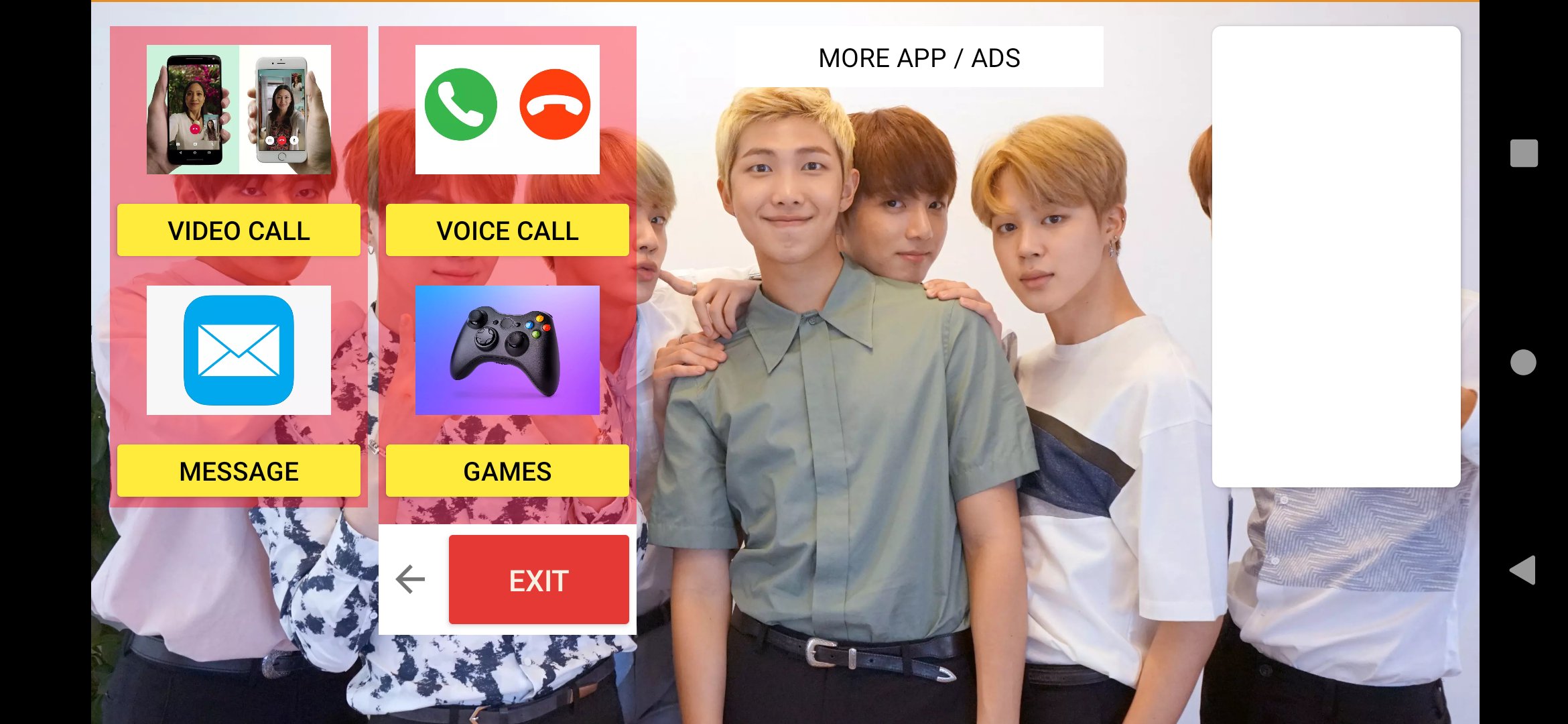 BTS-V Kim Tae-Hyung Video call and chat is a simple and easy application for you to make a fake call video with your Celebrity Like Nastya and chat live with her, Enjoy calling your favorite actor BTS-V Kim Tae-Hyung and chat in an easy way, feel free and download this BTS-V Kim Tae-Hyung puzzle Video call app for fun and prank your friends.