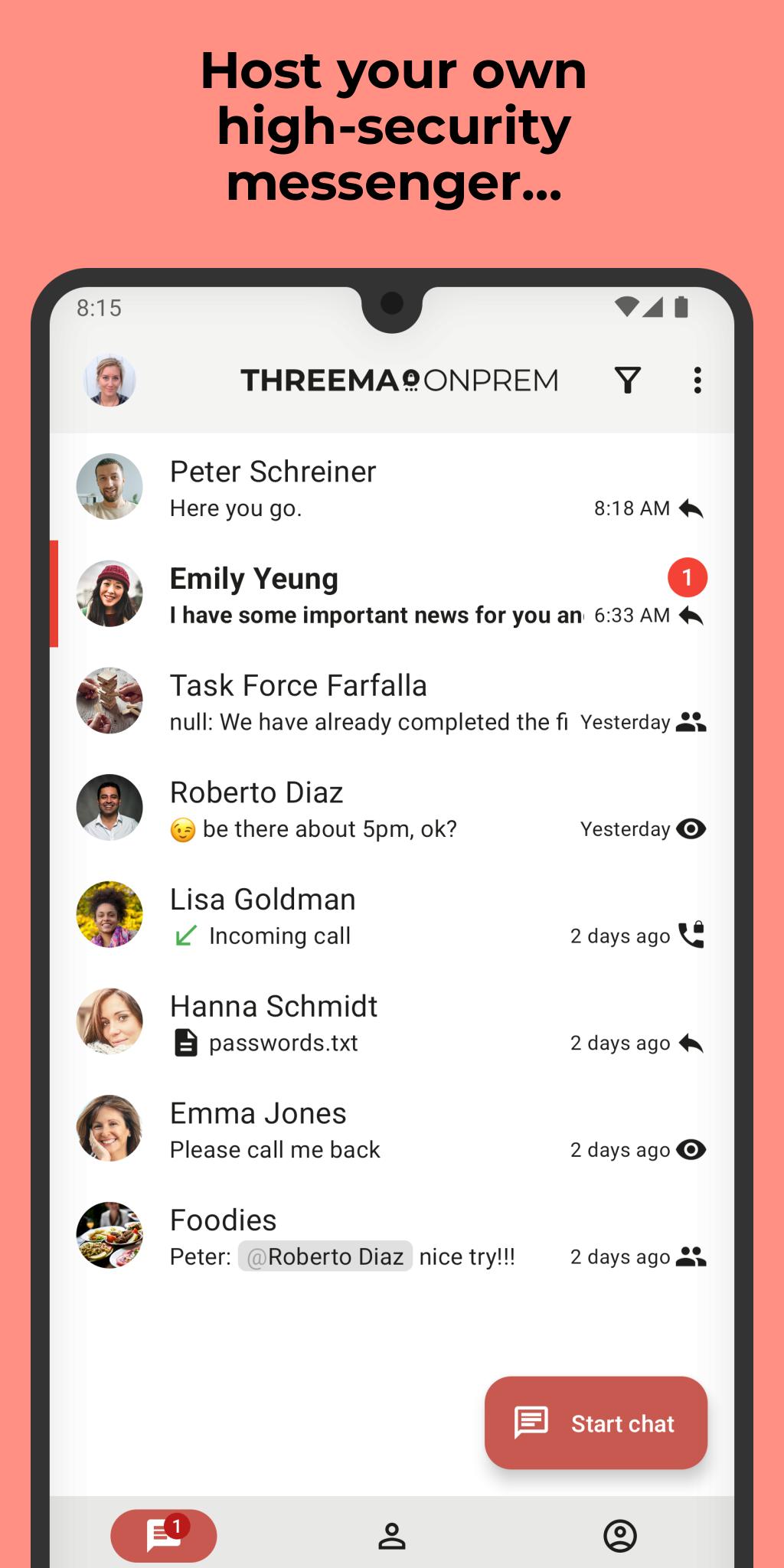 Threema OnPrem is the self-hosted messaging solution for organizations that require maximum security. The combination of Threema’s well-established security architecture and total data ownership results in a self-contained chat environment that is unparalleled in terms of confidentiality and is suitable for professional use in government agencies, police forces, and industrial companies.