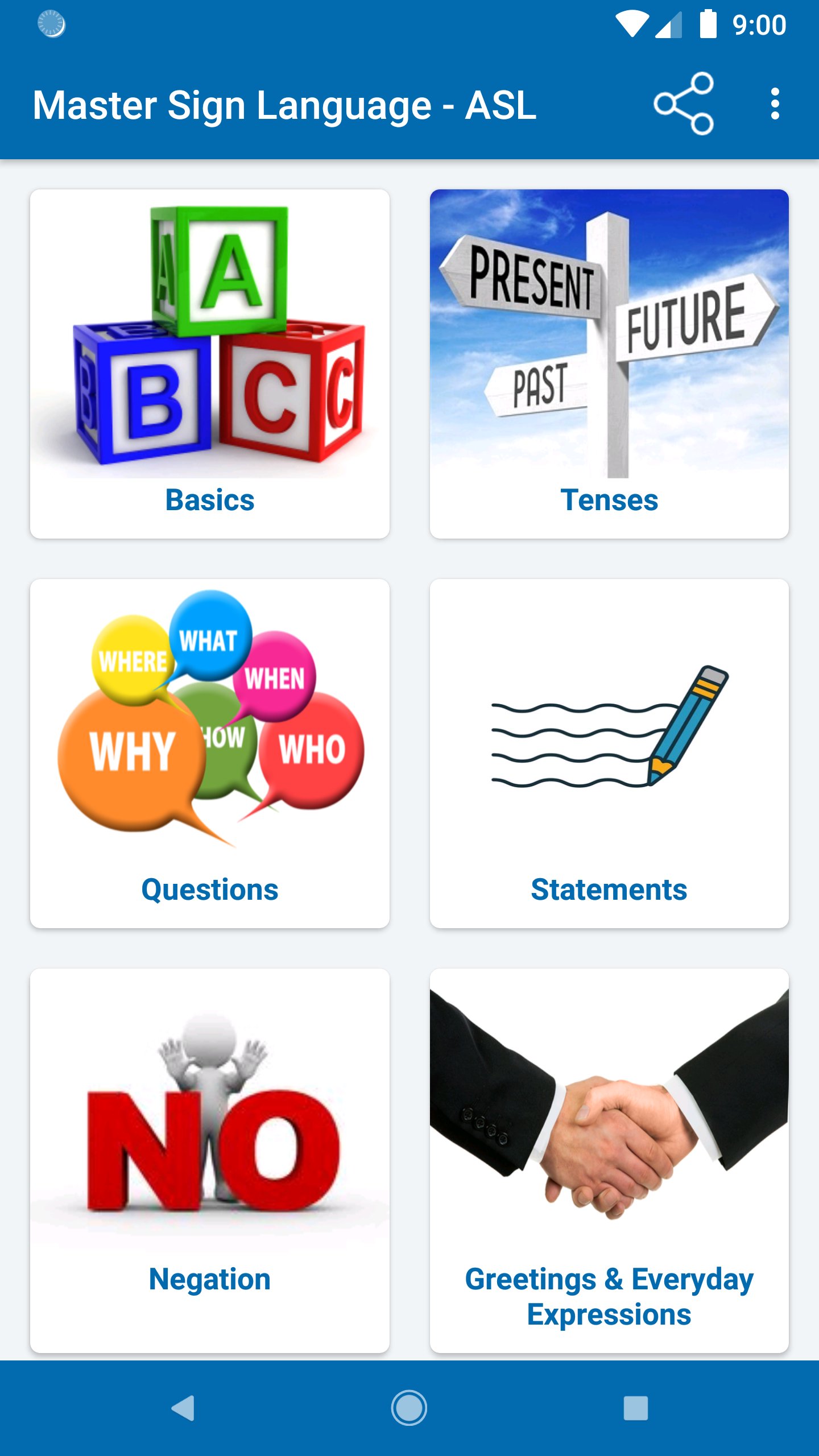 You can share the learning experience with family and friends by having them watch while you form the signs and see if you are signing it the way the images appear in the App.