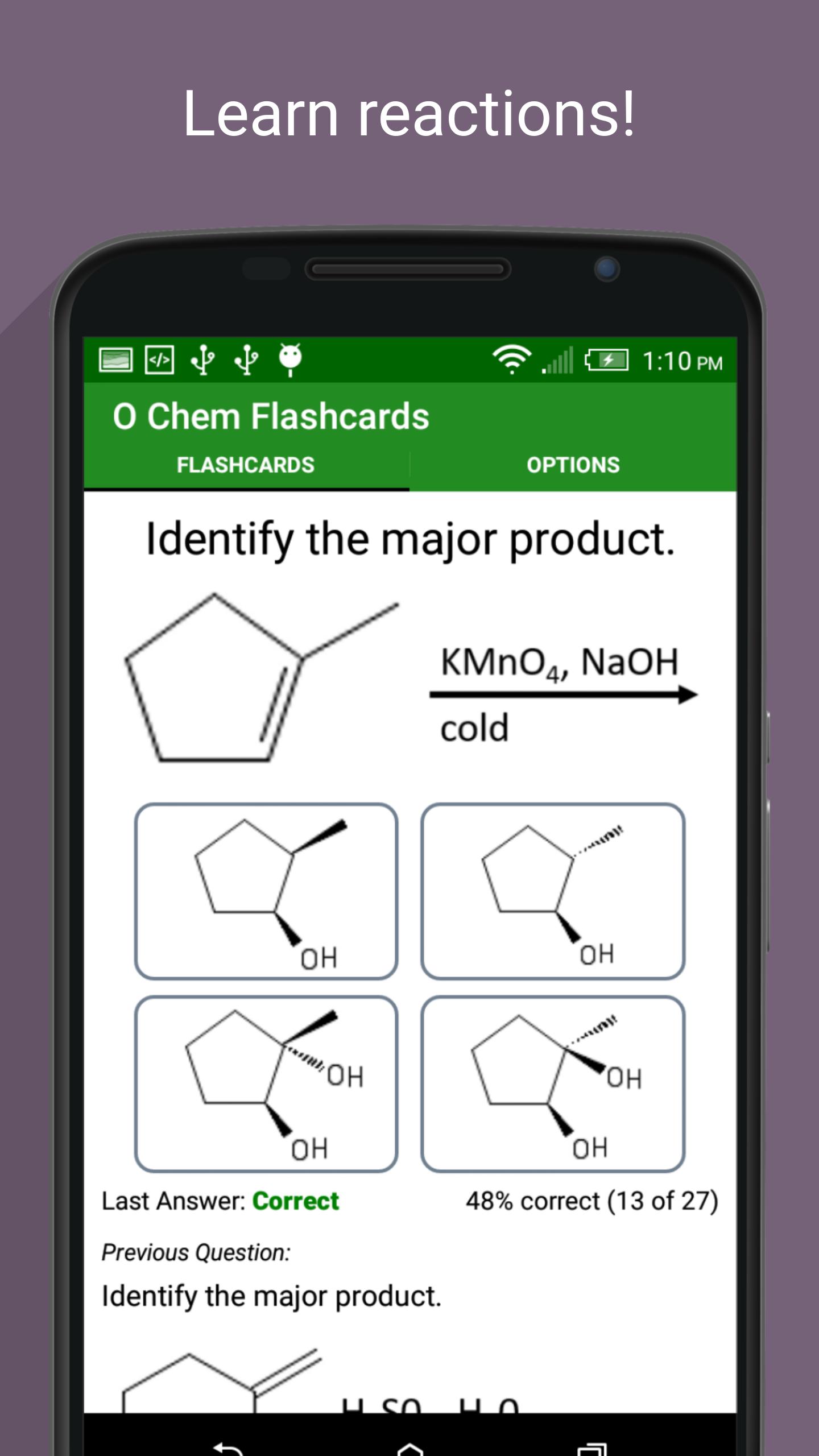 The subjects can be filtered out on the options tab (accessible by swiping right) so you only study the subjects you need to. For example, if you only want to study organic chemistry reactions, just select those categories. Your organic chemistry subject selections save across restarts so you are ready to go right when you open the app.