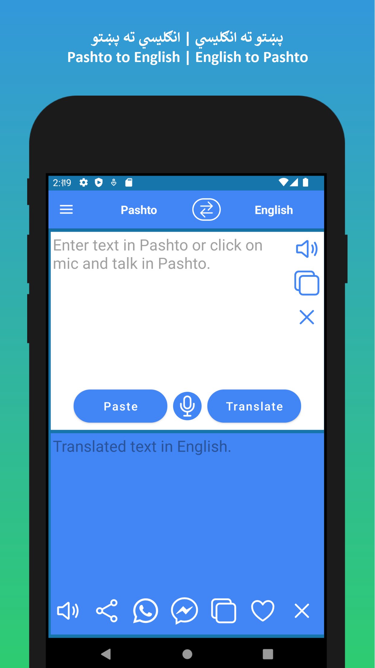 ✓ Use it as a Dictionary. You can type your words in English and get the exact word in Pashto. You can type your words in Pashto and get the exact word in English.