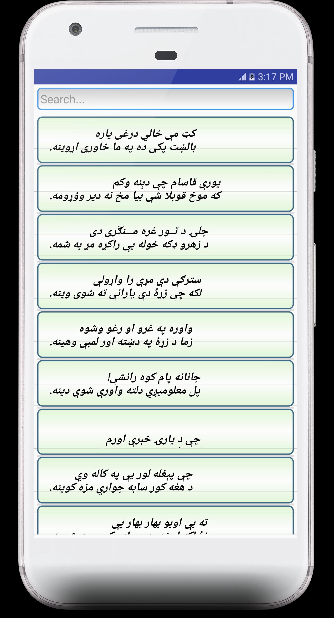This app contains Pashto Tappay / Pshto Text Messages and shayri afghan pashto poetry tapy. this is one of bigger and better collection of sms or mobile / text messages in pakhto languages of Khyber Pakhtoon Khwa KPK and afghan etc. This app contains huge collection of pashto sher. Spread pakhto tappay messages in your family and friends on facebook, whatsapp, or SMS.
