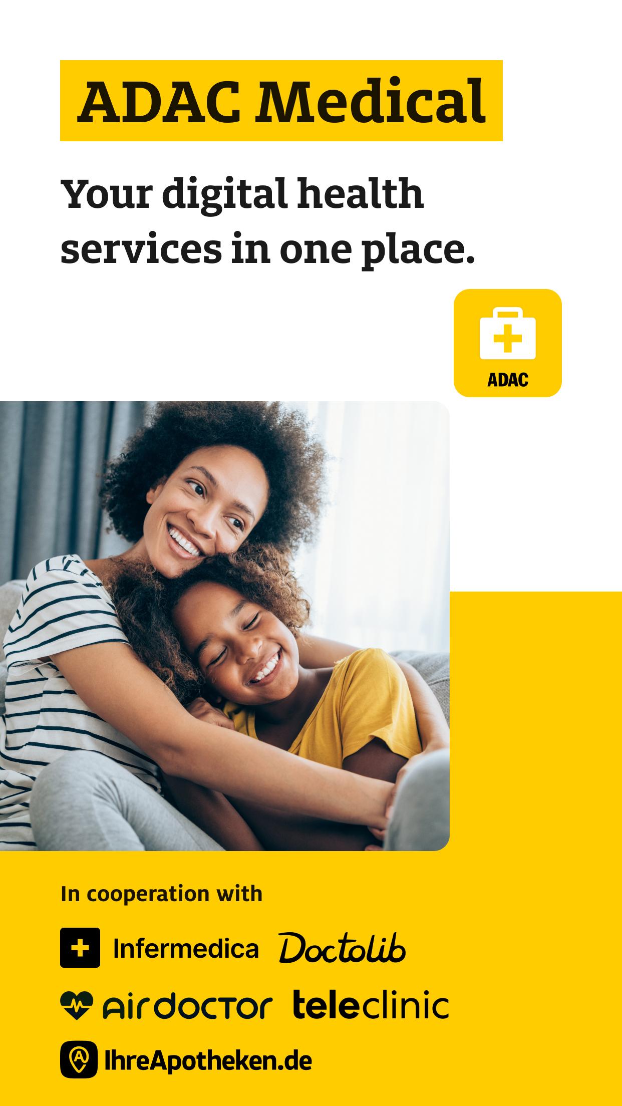 ADAC Basic, Plus or Premium membership or ADAC Auslandskrankenschutz (international health insurance) is required to access telemedicine and doctor searches via our partner TeleClinic via the ADAC Medical health app. Please note that an active German statutory or private health insurance is required to use TeleClinic's services. Furthermore, the Medical health app offers you the opportunity to make appointments with a doctor or gp in your area around the clock via our partner Doctolib GmbH - for you and your family. Finding & booking a doctor has never been easier!