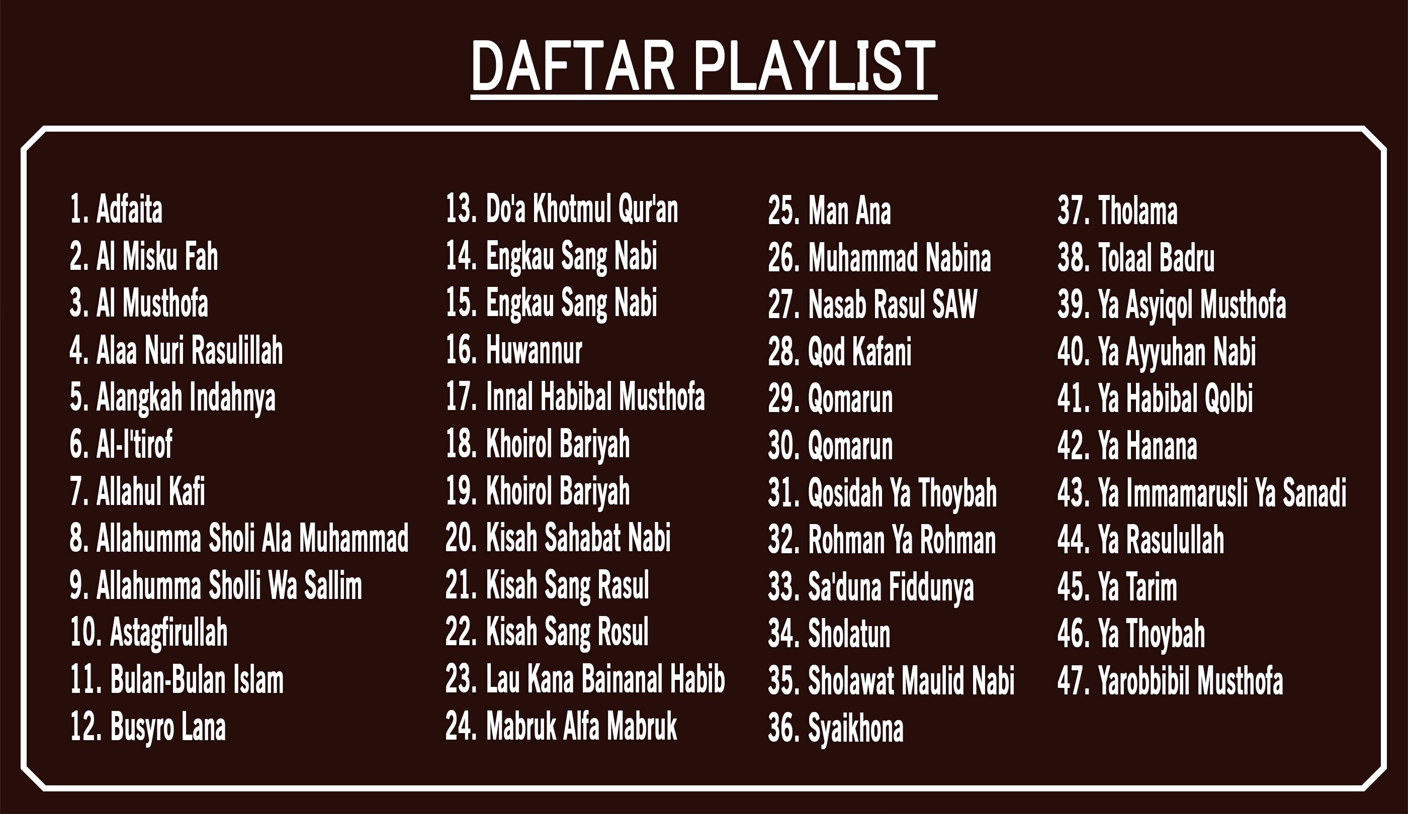 This application contains a collection of sholawat and qasidah chants from Muhammad Hadi Assegaf and also sholawat from Habib Sych which we have summarized and arranged in several playlists