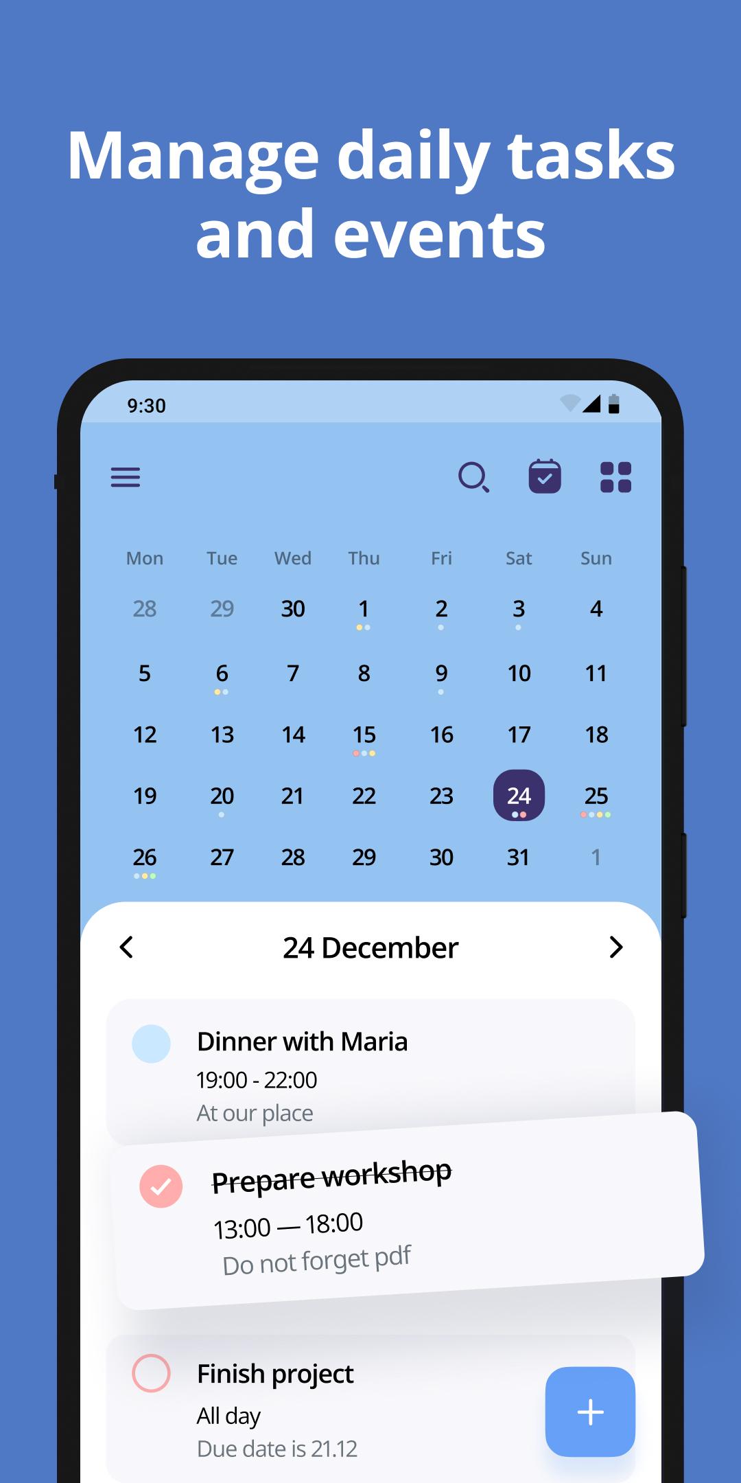 The app provides you a way to switch between monthly, weekly, daily or even yearly views to manage your tasks and agenda with ease. Events allow you to setup repetitive reminders, choose event location, description. Never miss any meeting or skip a gym session with multiple reminder options.