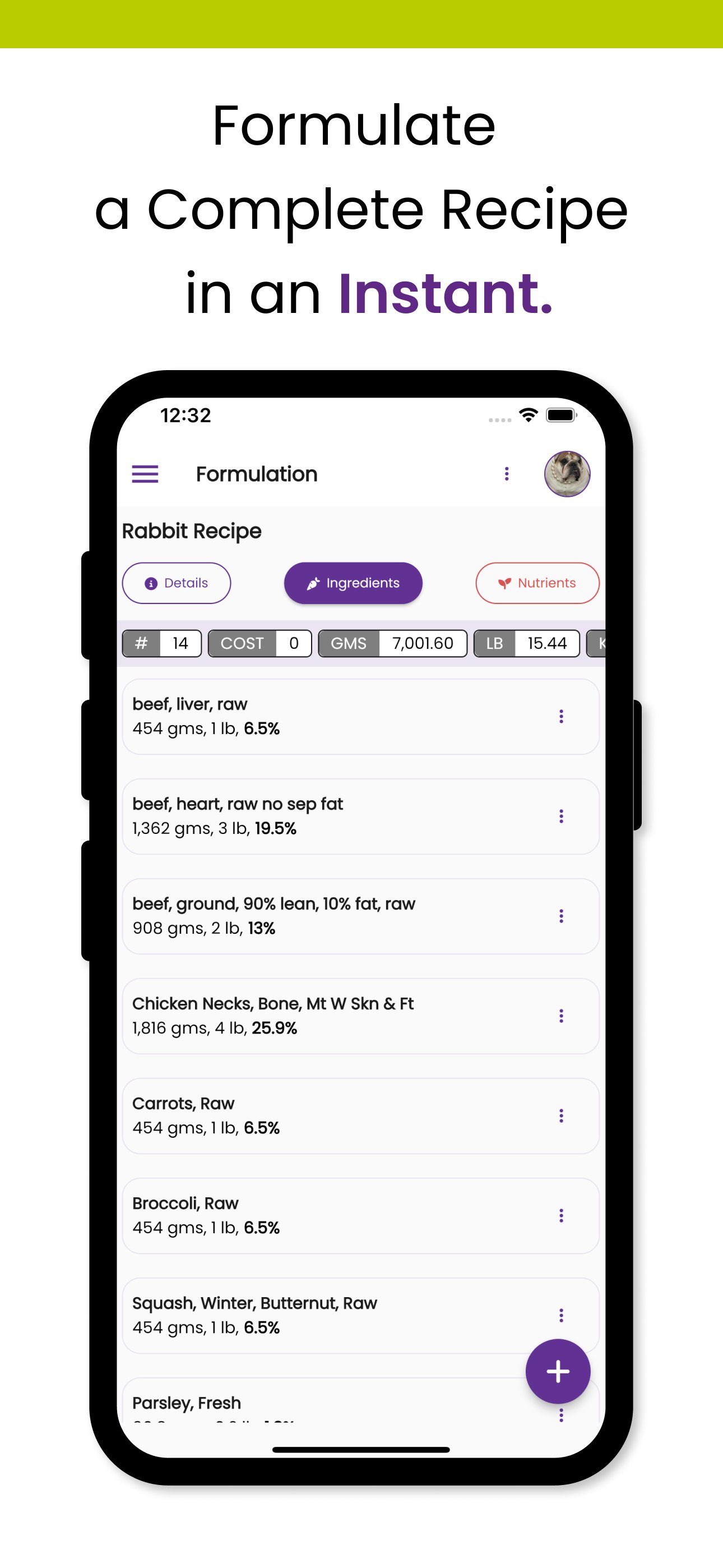Our software program stays up to date with USDA nutritional data, formulates to meet AAFCO and FEDIAF standards, and considers life stages from gestation/lactation to geriatric, in addition to activity levels for dogs and cats.