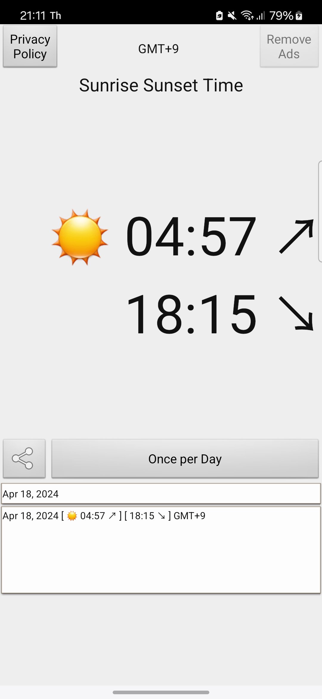 A free app that displays the sunrise and sunset times of today's GPS measurement current location. Time zone of current location, sunrise and sunset time history retention.